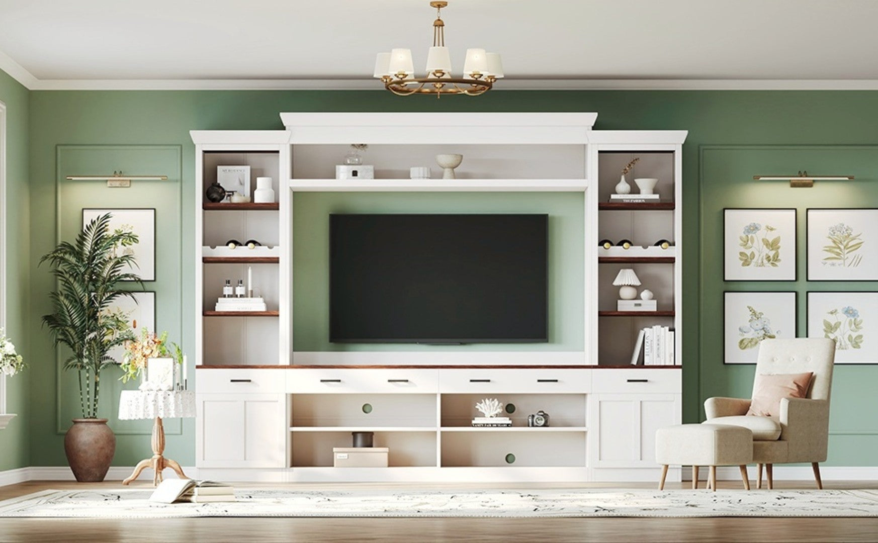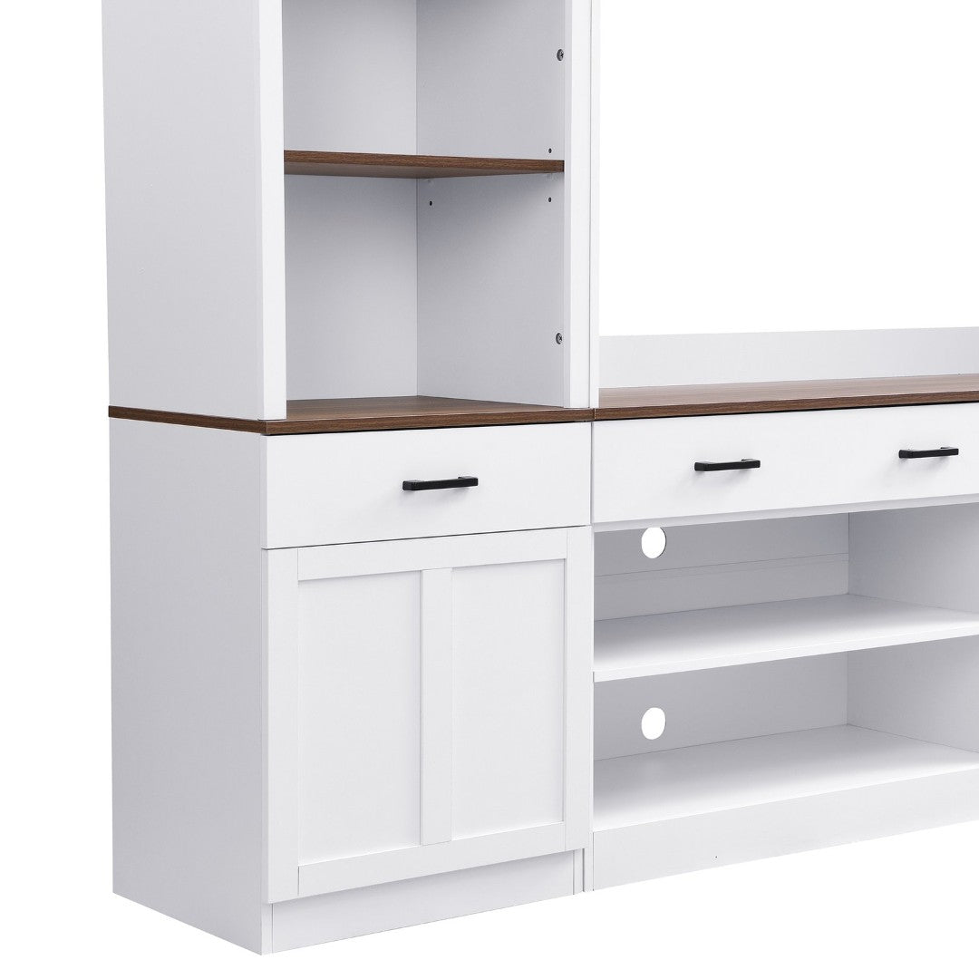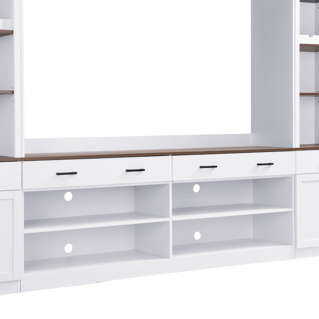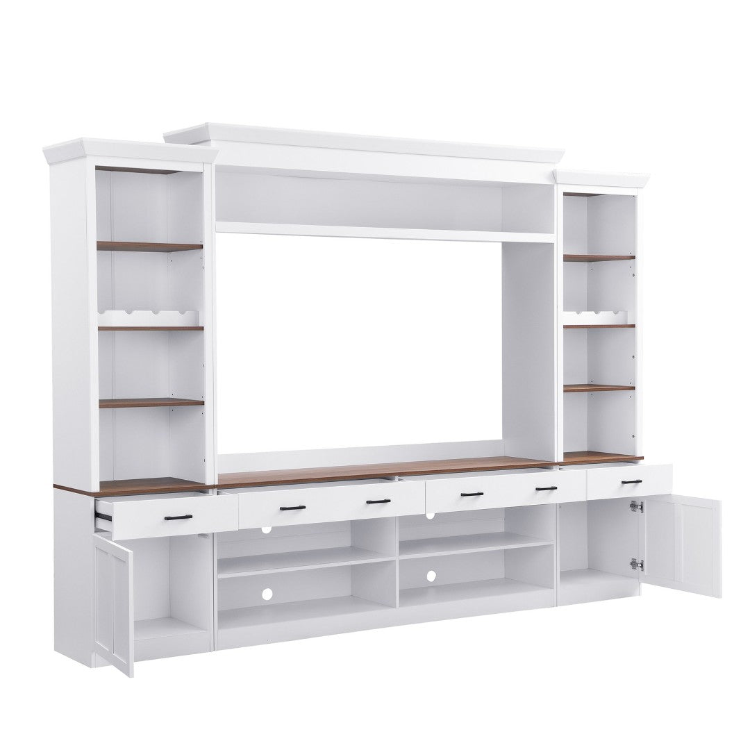Bring cohesive farmhouse style and versatile storage to your living room with this all-in-one 4-piece entertainment wall unit. Thoughtfully designed for large TVs and everyday entertaining, it combines open shelving, drawers, cabinets with wine racks, and a central media console to keep electronics, decor, and beverages organized while adding a warm walnut-and-white mid-century look to your space.