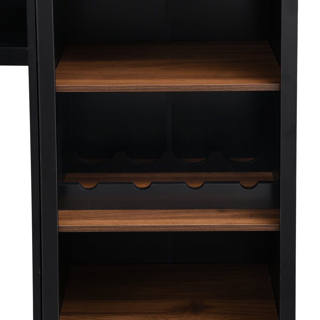 Engage guests and organize your living room with this mid-century inspired farmhouse entertainment wall unit that combines style and function. Designed for TVs up to 70", the set pairs a walnut-finish tabletop with black accents and retro handles for a warm, contemporary look. With multiple storage options, adjustable shelving, integrated wine racks, and cable management, it keeps media components, decor, and beverages neatly displayed and accessible while offering sturdy construction for everyday use.