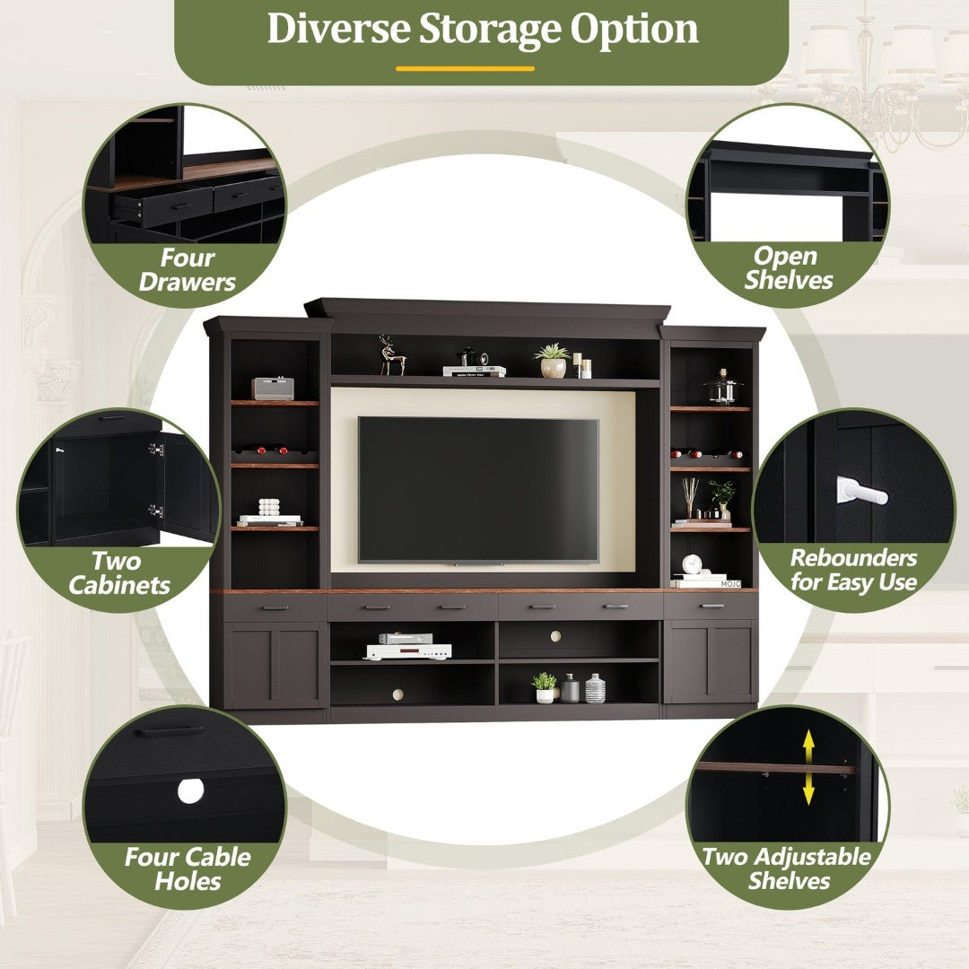 - Diverse Storage Option: This product boasts four drawers, open shelves and two cabinets, while the bottom cabinets have rebounders for easy use. The middle back panel incorporates four cable holes for organizing your media device wires. With two adjustable shelves on each side, it provides an ideal display space for your varied collections.