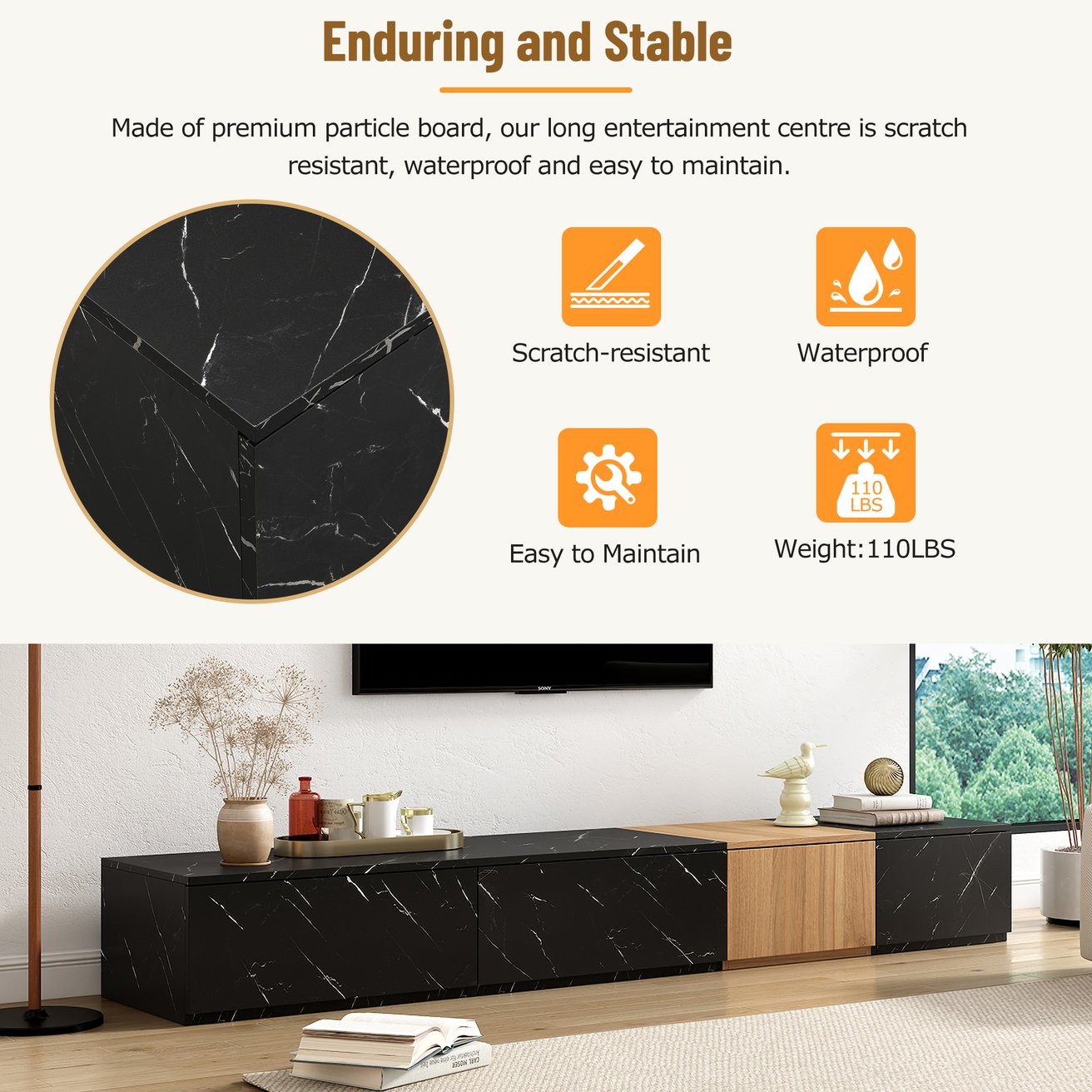 - Made of premium particle board, our long entertainment center is scratch resistant, waterproof and easy to maintain. The sturdy tabletop can also supports up to 110 pounds, ensuring stability and reliability for your valuable electronics and entertainment accessories.