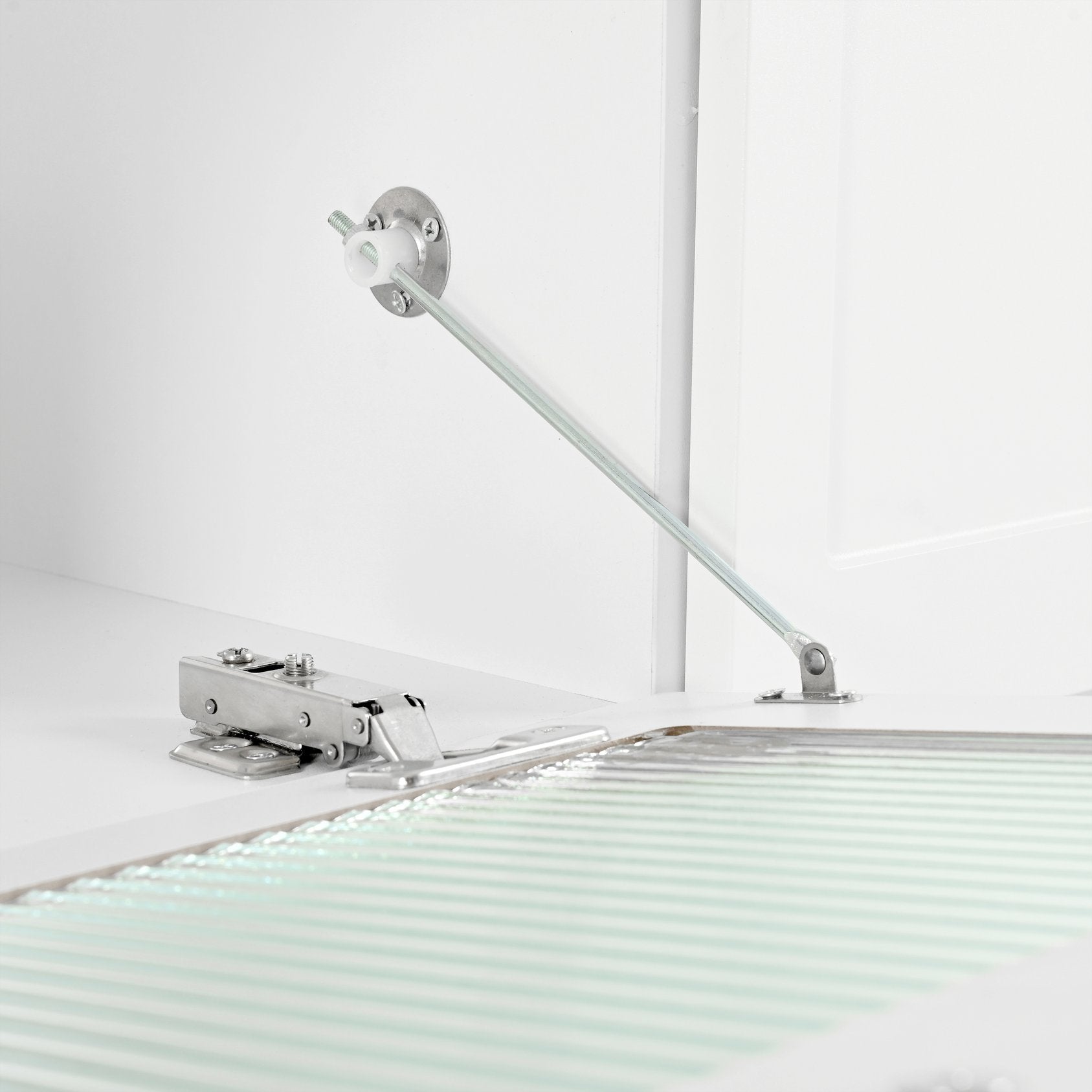 - Stylish construction: White MDF veneer top and base with distinctive geometric styling and translucent fluted tempered glass arched doors for a contemporary, airy look.