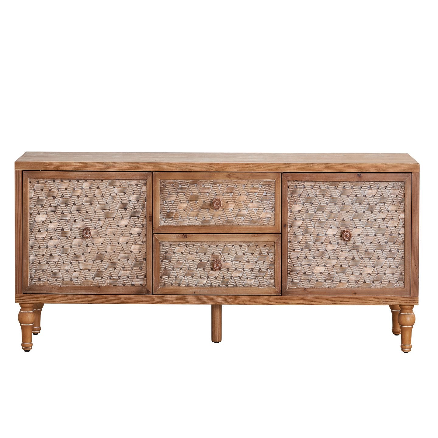 - Style & finish: Natural rattan-look doors paired with a distressed mid-century wood finish for a boho-modern aesthetic