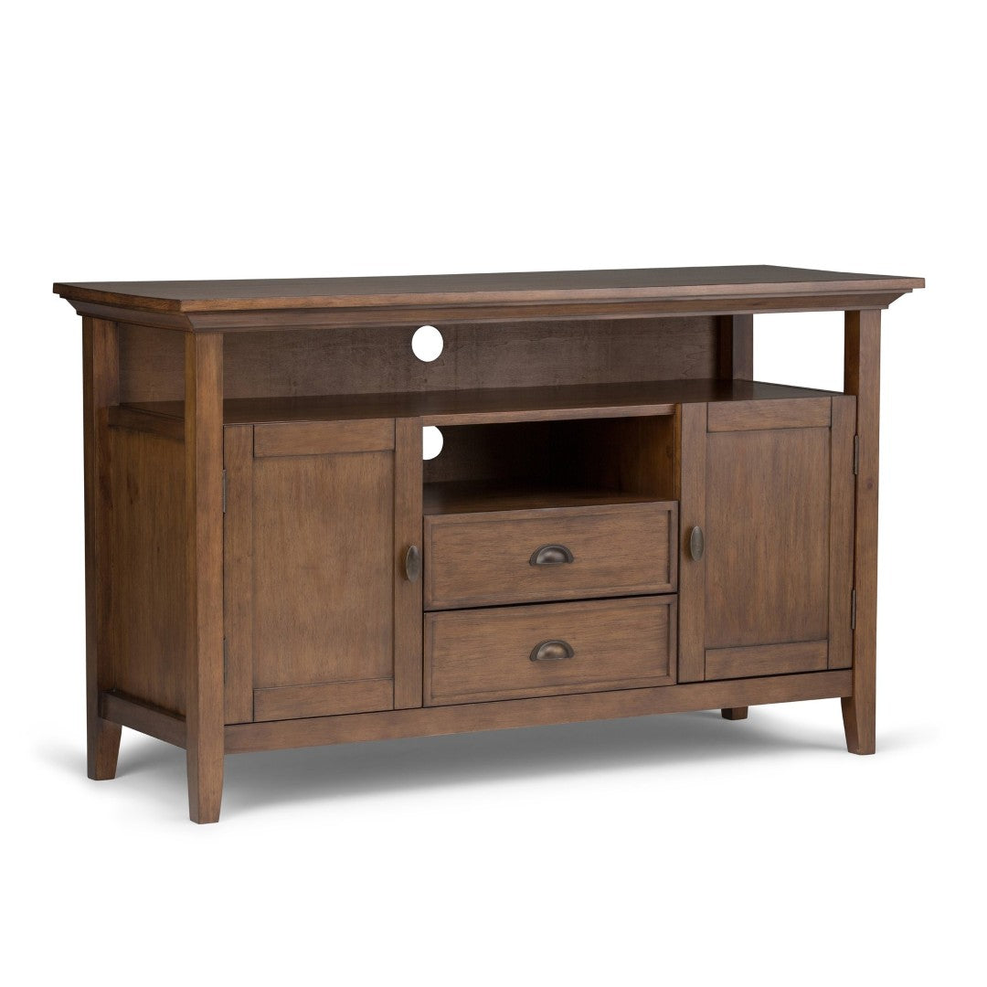 Bring rustic warmth and practical storage to your living room with this handcrafted tall TV media stand. Built from solid wood and finished in a Rustic Natural Aged Brown stain, the piece blends transitional design details with thoughtful functionality to support TVs up to 60" while keeping media components organized and accessible.