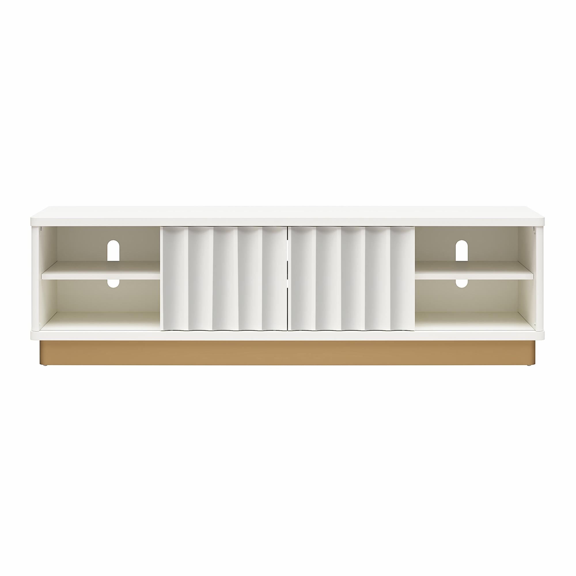 Bring modern glamour and clever functionality to your living space with this sculptural TV stand. Its eye-catching scalloped silhouette and glossy white finish create a striking focal point, while smooth horizontal sliding doors and built-in wire management keep entertainment areas tidy and effortless to use. Designed to support most flat-screen TVs up to 65", this piece balances chic styling with everyday practicality.