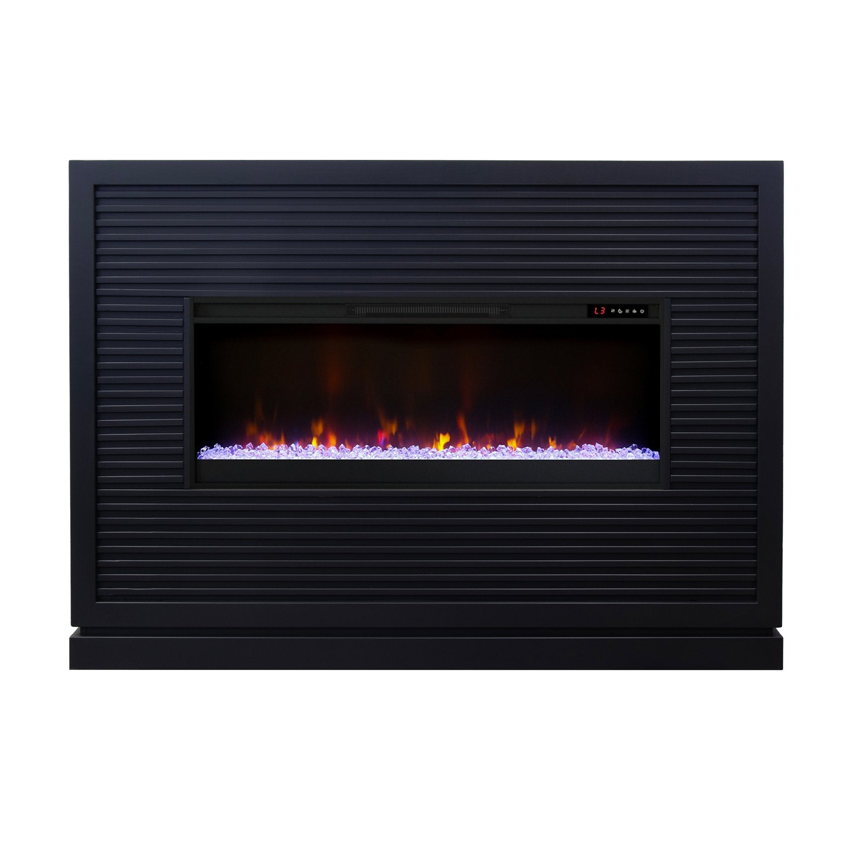 - Fireplace insert with crystals or faux logs and 7 flame color options, 42” wide x 17” deep x 17” high