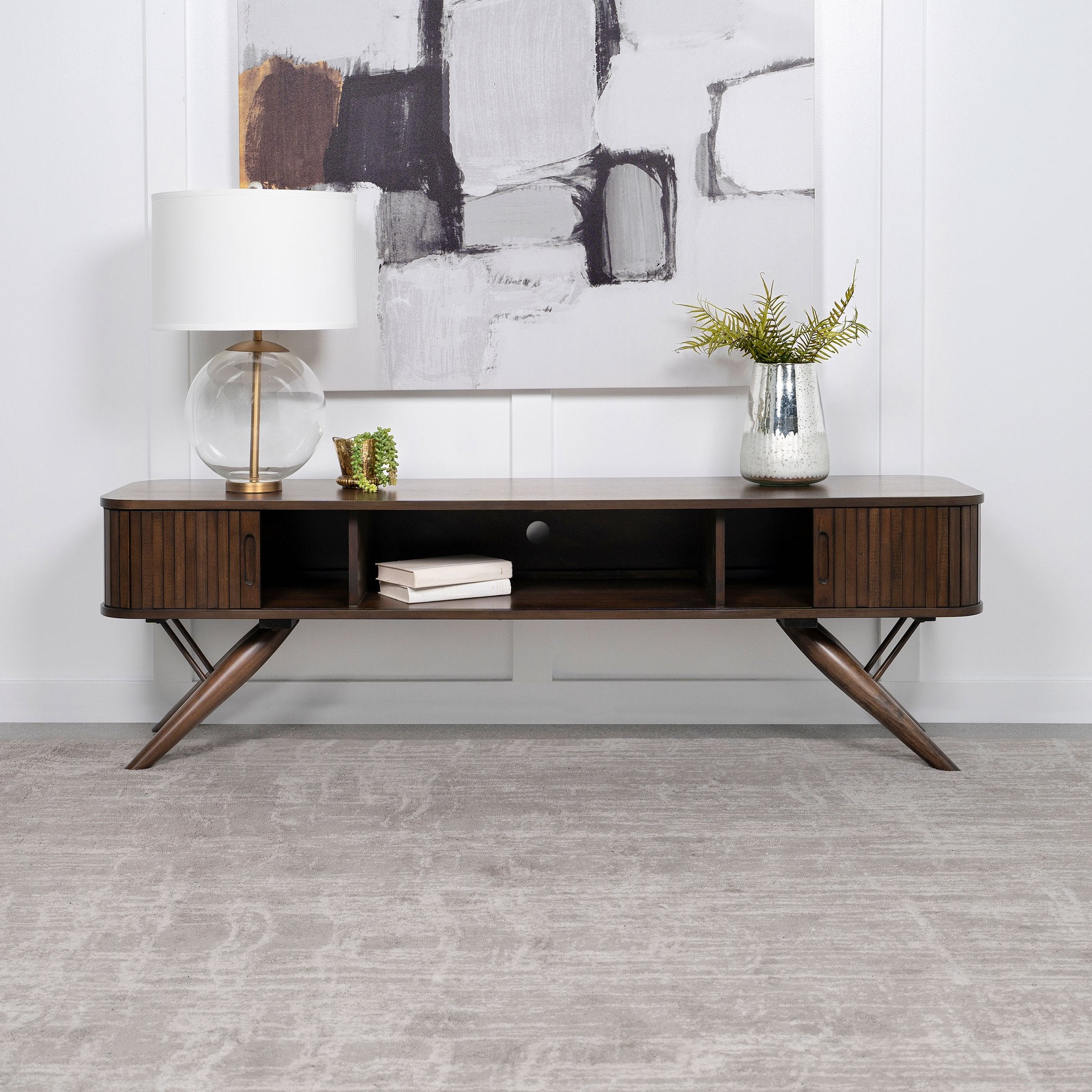 Elevate your living room with a mid-century inspired TV stand that blends timeless style and everyday functionality. Warm walnut tones, sculpted splayed legs, and vertically ribbed sliding doors create a refined focal point, while clever storage and cable management keep your entertainment area neat and accessible.