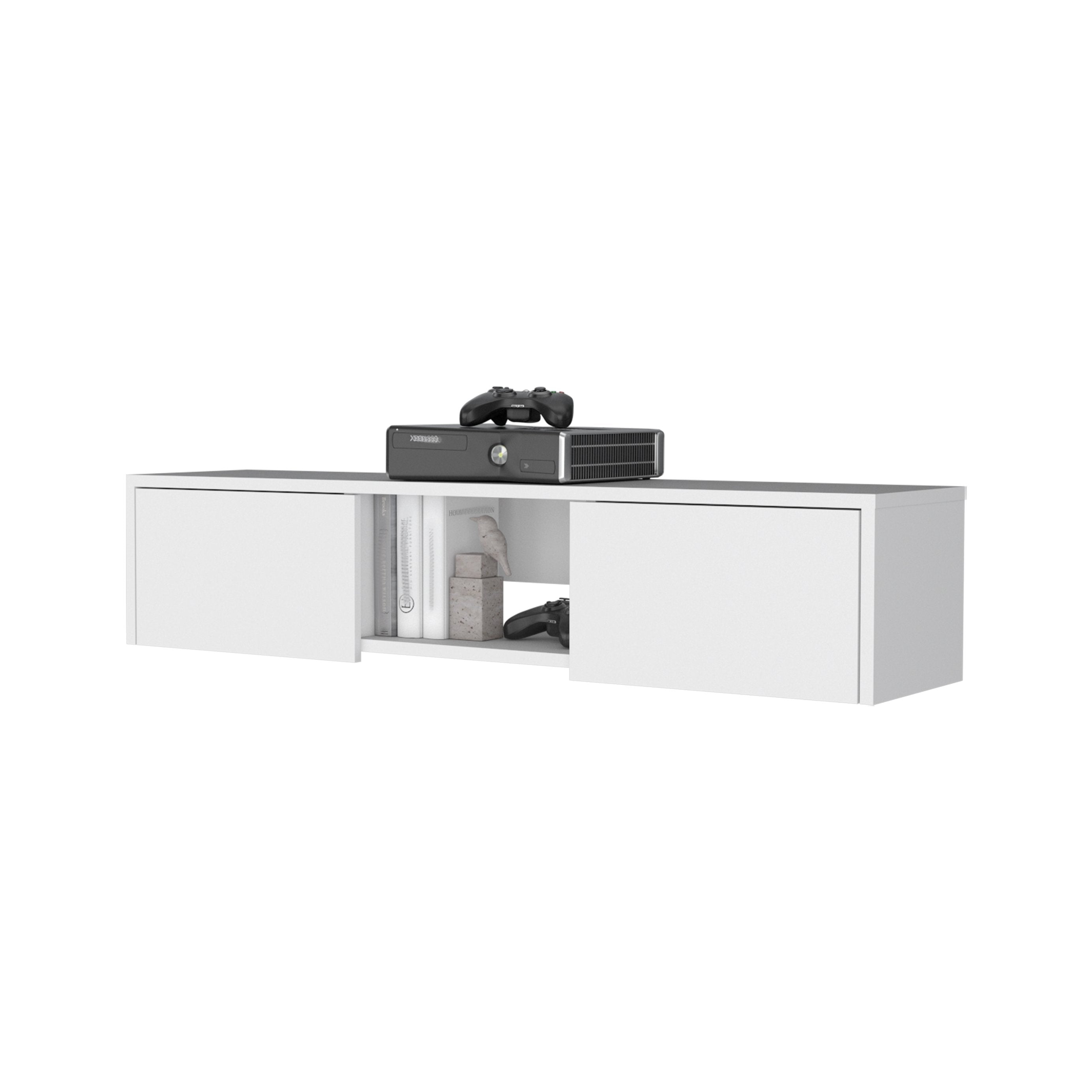 Bring clean lines and modern efficiency to your living room with the Tabor Floating TV Stand. Designed for contemporary spaces, this wall-mounted unit keeps electronics and media clutter off the floor while presenting a sleek, white manufactured wood finish that complements a variety of decors. Its mix of hidden storage and an open shelf provides flexible organization for consoles, remotes, and accessories, with integrated cable management for a tidy installation.