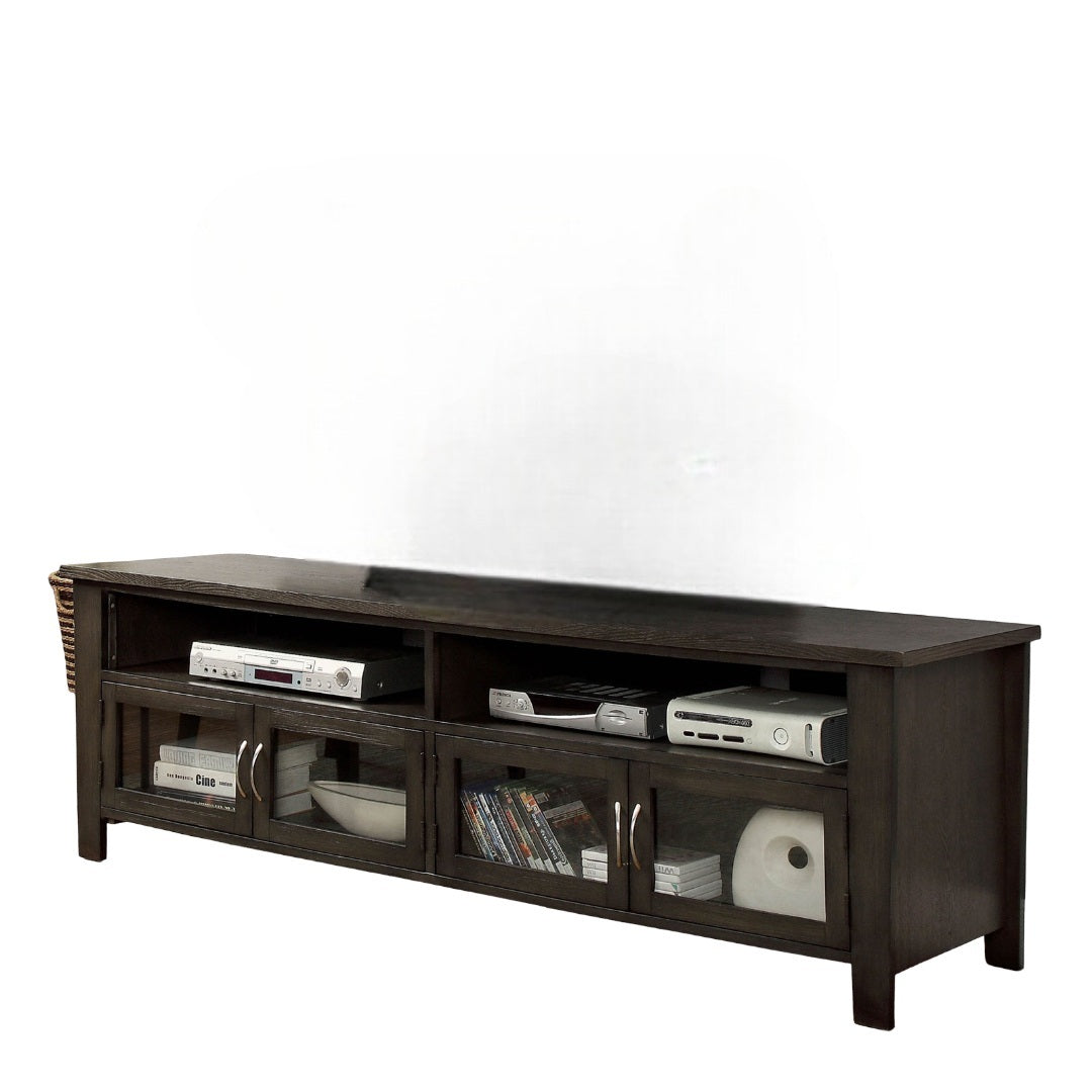 Give your living room a clean, versatile centerpiece with this transitional TV console. Designed to balance open display space with concealed storage, it supports a large TV while keeping cables and accessories neatly organized. The gray finish and tempered glass cabinet doors add a modern touch that suits a range of decor styles.