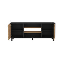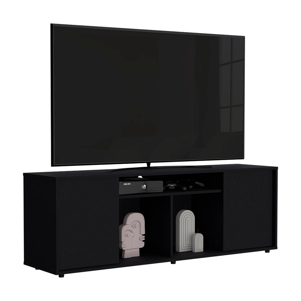 Give your living room a sleek, contemporary upgrade with this black TV stand designed for both style and organization. Built to support large TVs while keeping cords and components neatly stored, it combines open and concealed storage for a clean, versatile media setup.