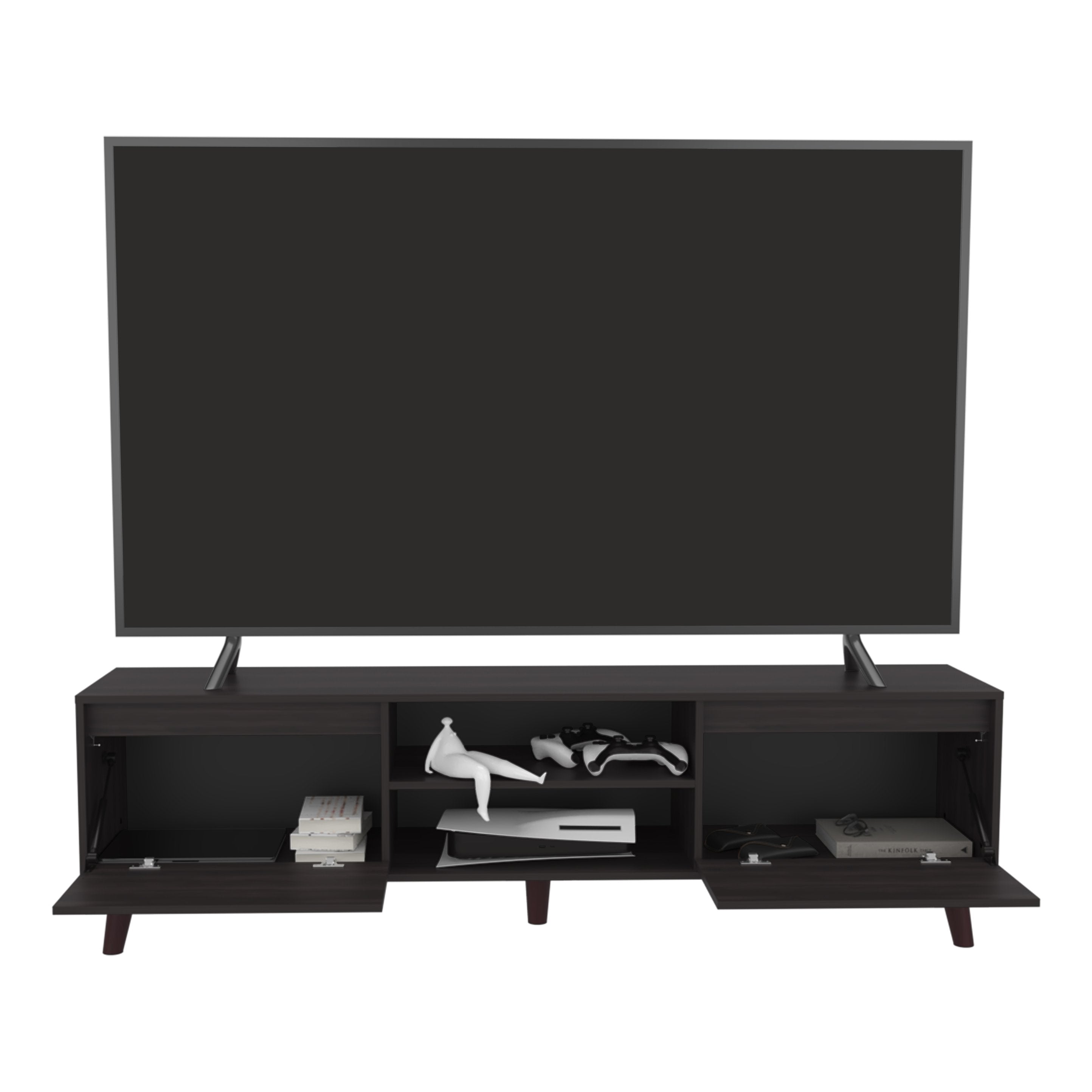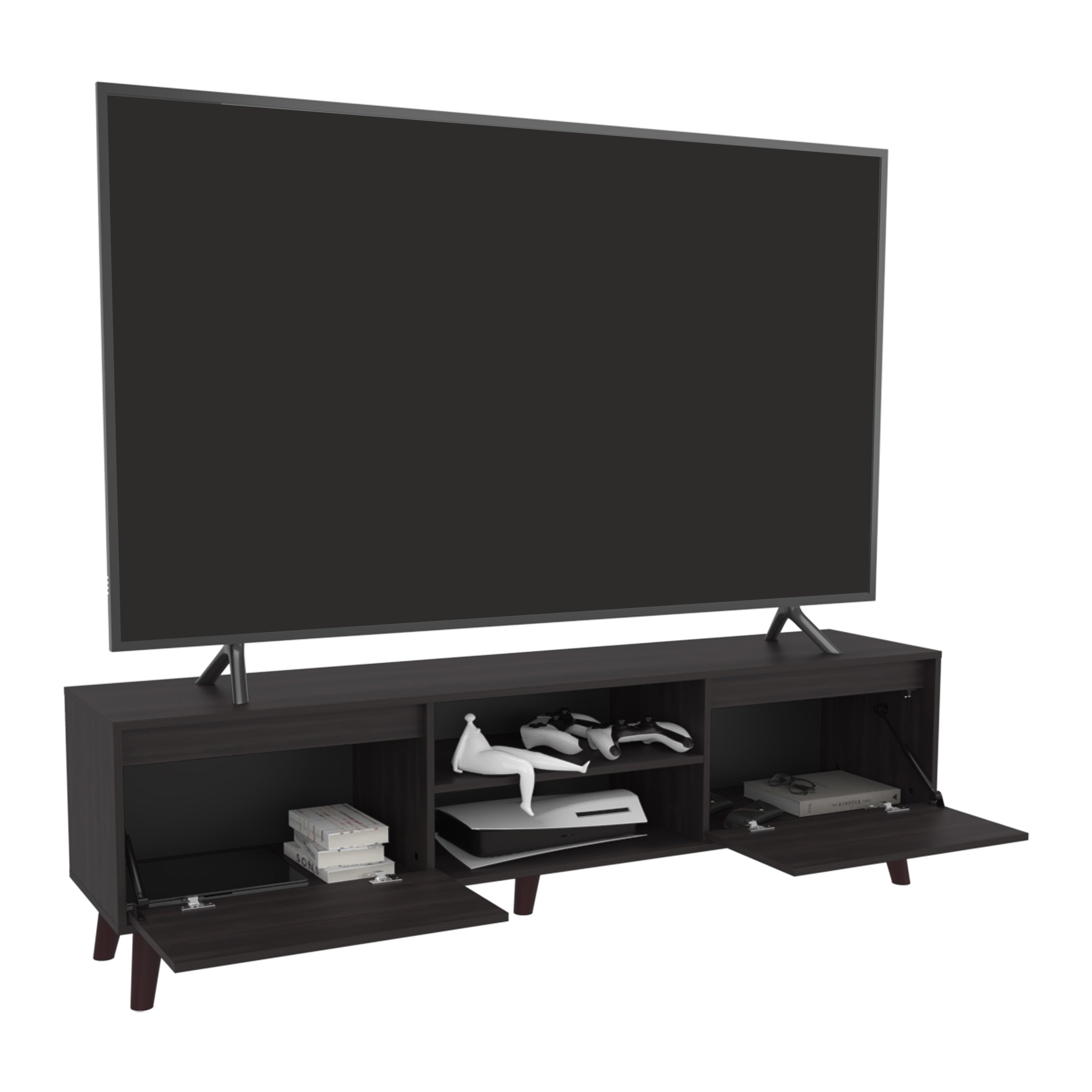 - Storage Configuration: Two cabinets with drop-down doors for concealed storage plus open shelves for AV components, consoles, and decorative items.