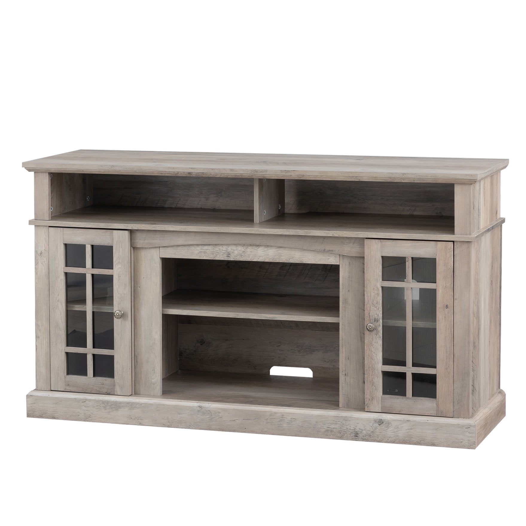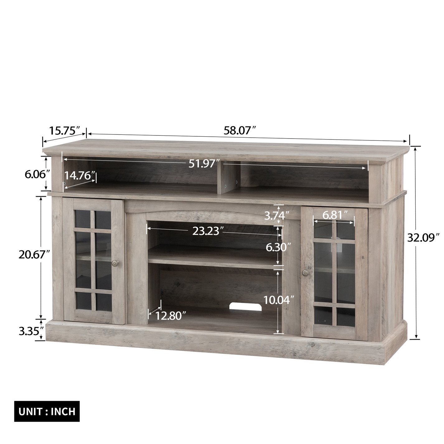 - This cabinet holds most 65/55/50-inch flat or curved tvs and can support to 70 pounds,each shelf can support up to 20 pounds. Size: 58.07" L X 32.09" h x 15.75"W.