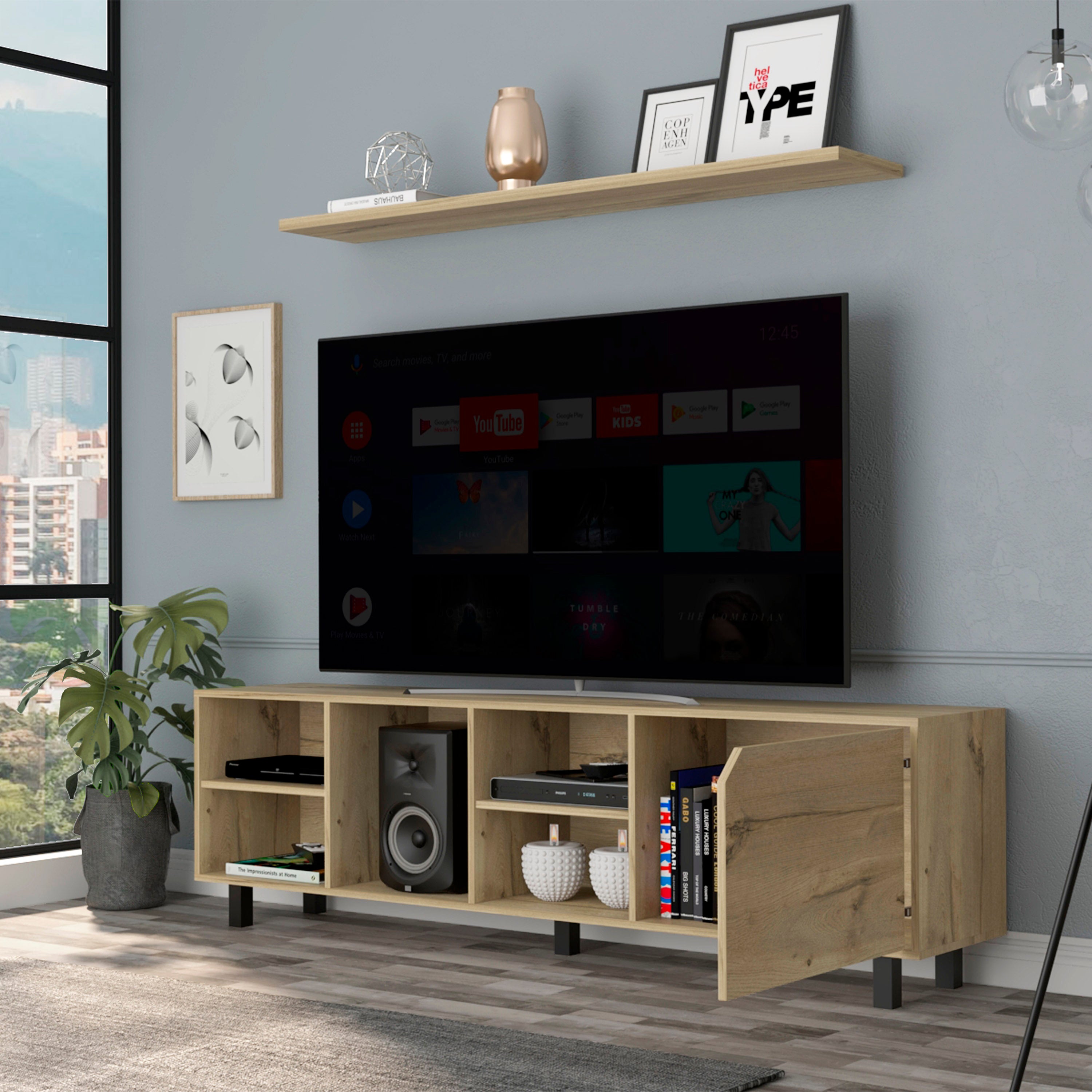 Bring modern functionality and clean Scandinavian style to your living room with this light oak TV stand. Designed to support TVs up to 70" while keeping media components and cables neatly organized, it blends open shelving for easy access with a concealed cabinet for tidier storage. Durable particle board construction and five sturdy legs ensure reliable support and a balanced silhouette that complements contemporary interiors.