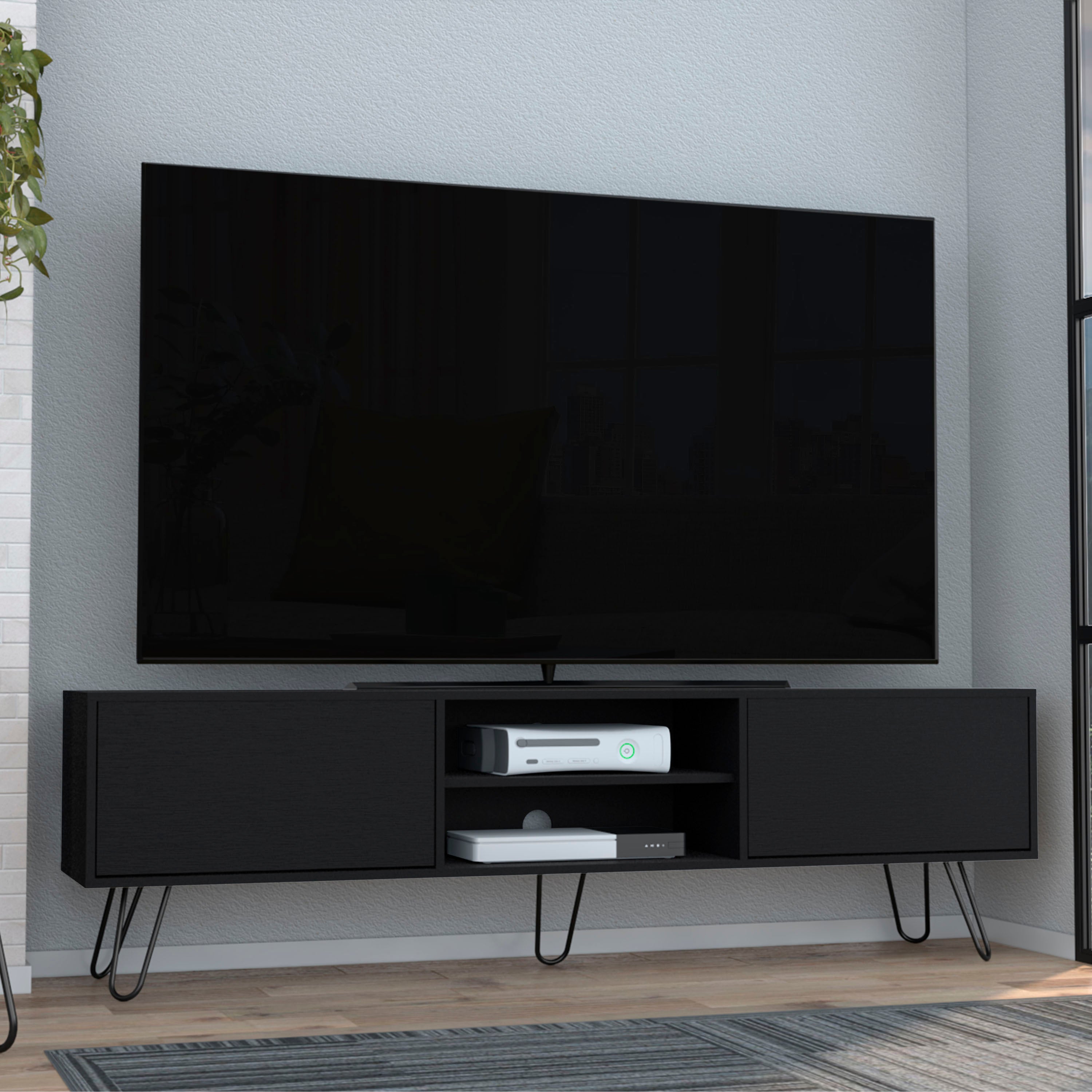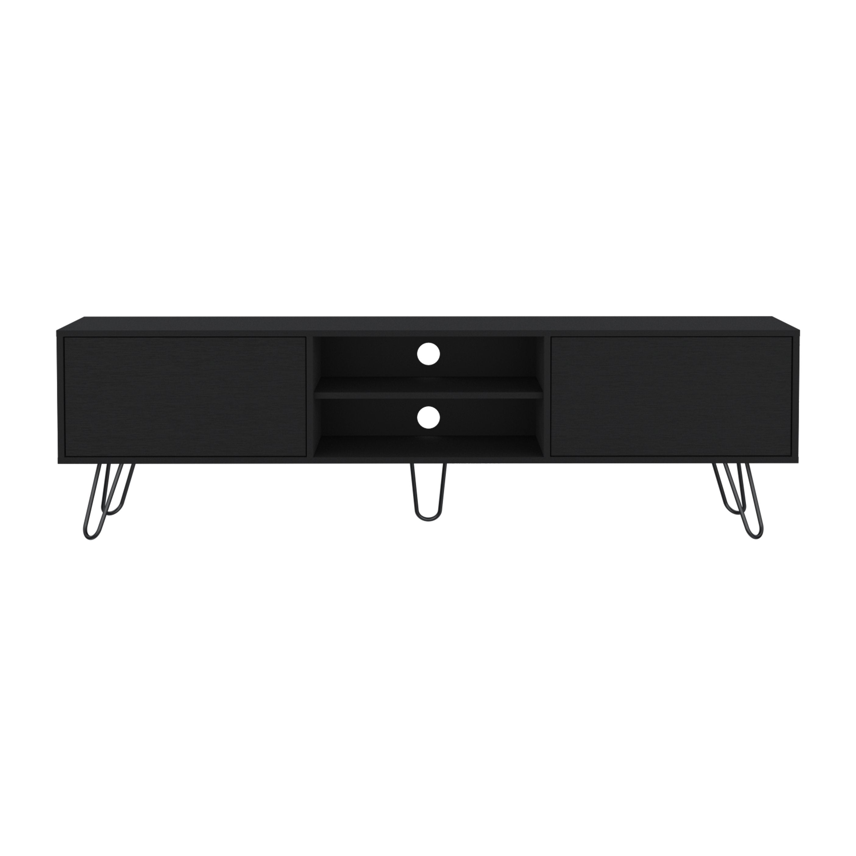 Upgrade your living room with a sleek, modern entertainment unit that blends contemporary style with practical storage. The Vassel TV stand offers an expansive top surface for large TVs, hidden drawer space for media and accessories, and open shelving for components and décor — all supported by distinctive hairpin legs for a clean, airy look.