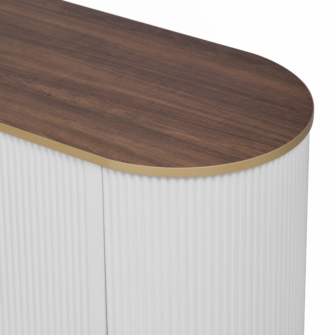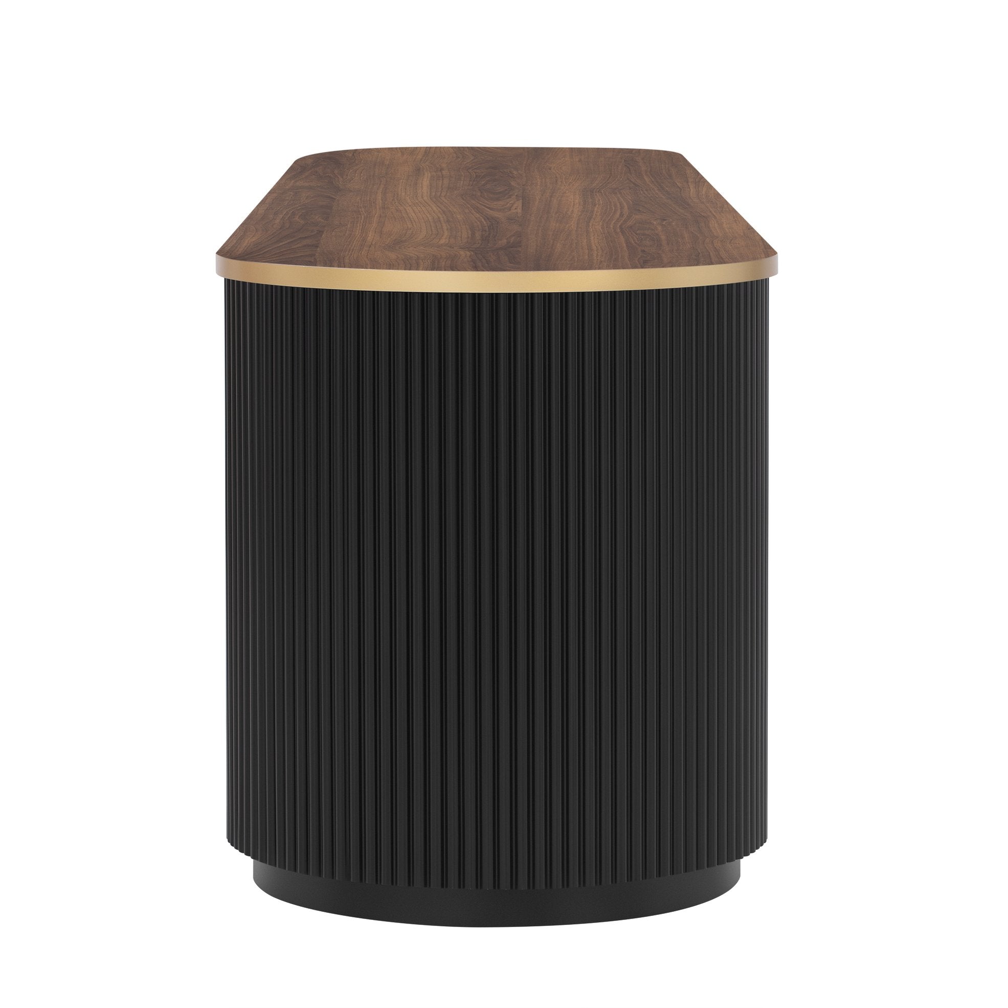 - Classic color schemes distinguish this piece. The tabletop is adorned with imitation wood grain veneer, complemented by sophisticated gold accents, crafting an ambiance of understated luxury. The curved sides, adorned with vertical grooves, enhance the TV stand's dynamic beauty. Reasonable size and layout enable cabinets to easily integrate into various home styles, enhancing the overall beauty of the home.