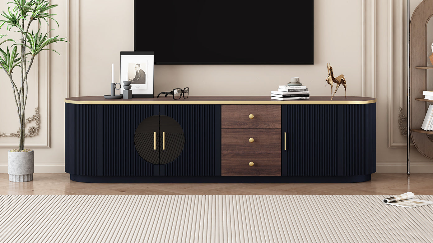 Transform your living room into a chic, organized retreat with a TV stand that balances modern minimalism and refined details. The warm wood-grain veneer, subtle gold accents, and elegantly grooved curved sides create a sophisticated focal point, while thoughtful storage and durable construction make it highly functional for everyday use. Designed to support large TVs and streamline your entertainment setup, this piece delivers both style and utility.