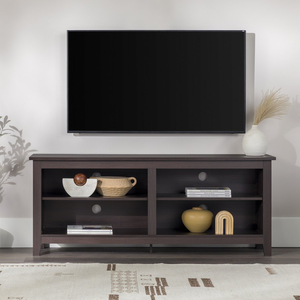 Give your living room a timeless, practical centerpiece with this classic open-storage TV stand in rich espresso. Designed for easy access to media components and an uncluttered silhouette, it combines durable construction with thoughtful details—perfect for modern or traditional spaces that need reliable storage and display for TVs up to 65 inches.