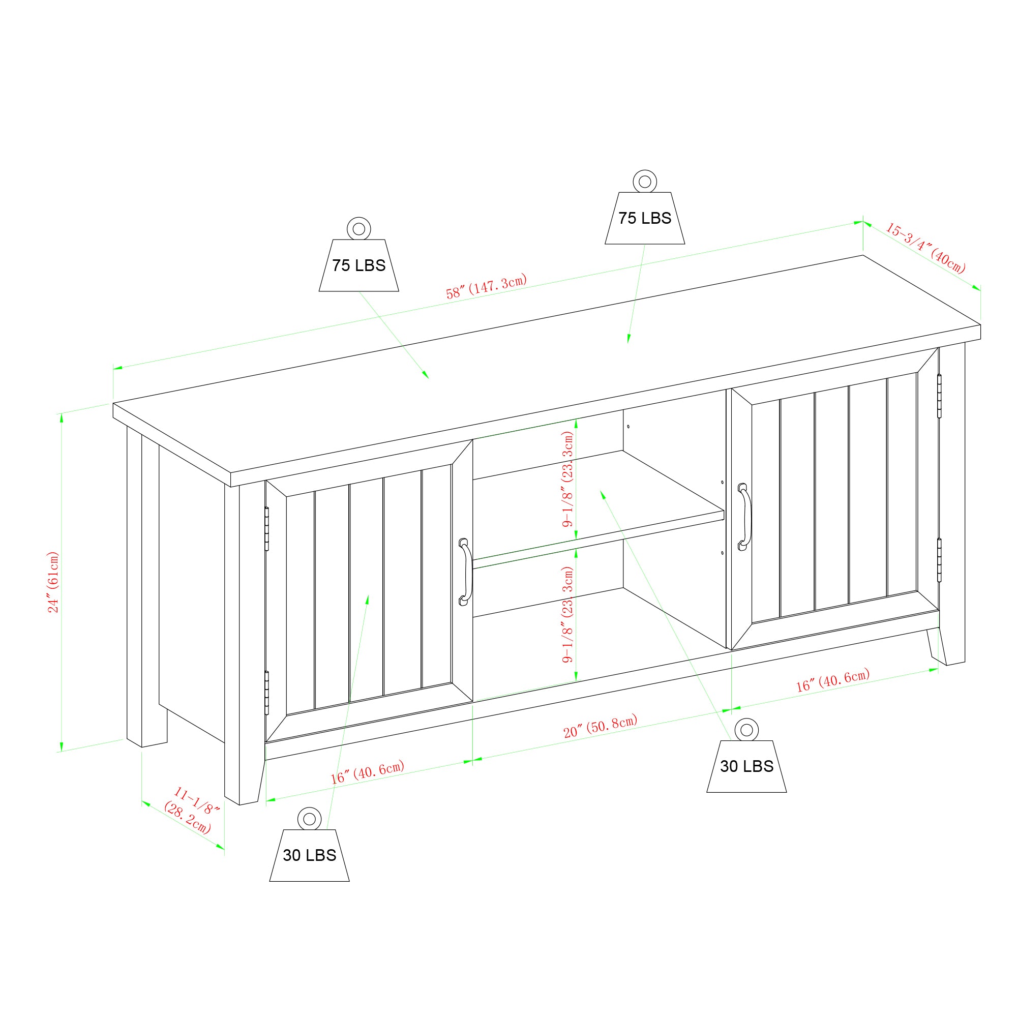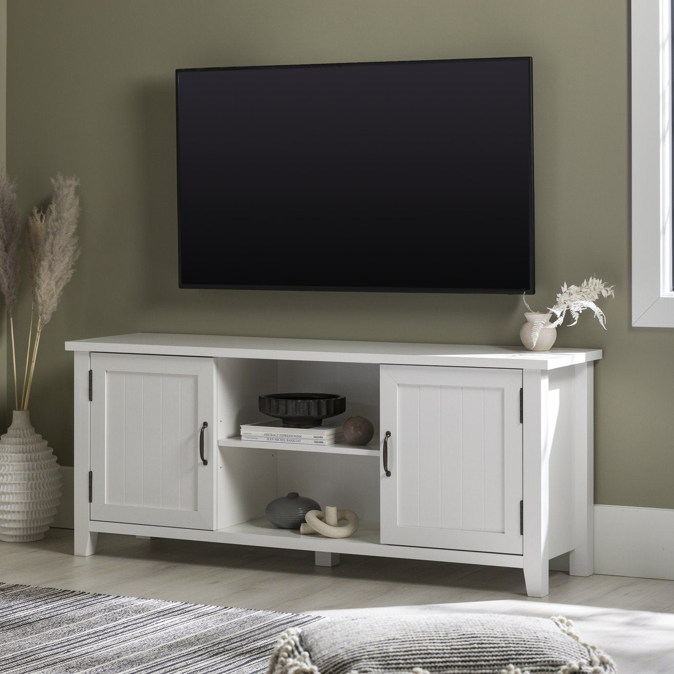 Give your living room a fresh, classic update with this solid-white TV stand—designed for both style and everyday function. Its beadboard grooved doors and antique-bronze hardware deliver timeless character, while a mix of open and concealed storage keeps media components, games, and décor neatly organized.