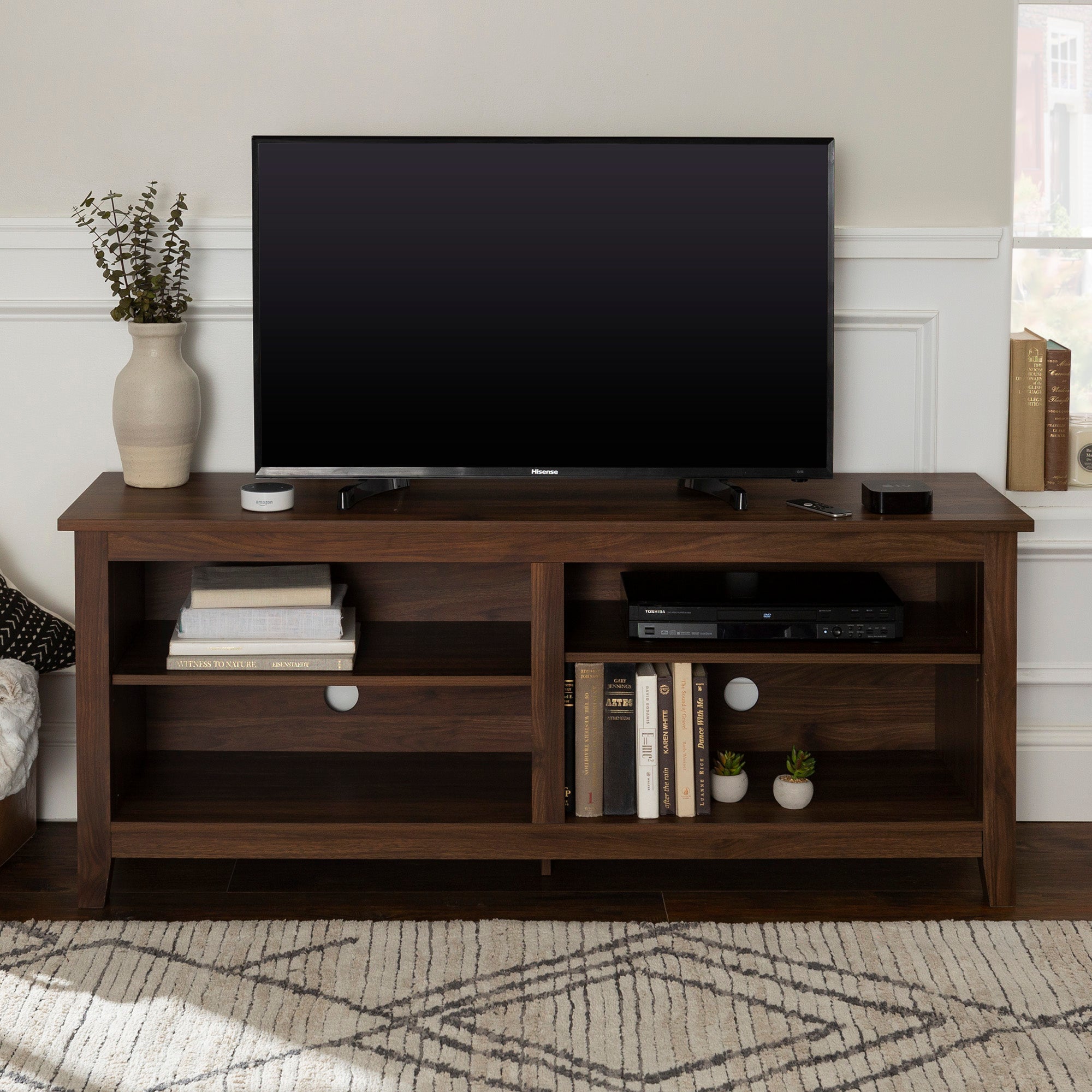 Enhance your living room with a timeless, open-storage TV stand that blends classic styling with practical organization. Finished in rich dark walnut, this durable engineered-wood piece provides sturdy support for large TVs while keeping media components, consoles, and accessories neatly accessible and well-ventilated.