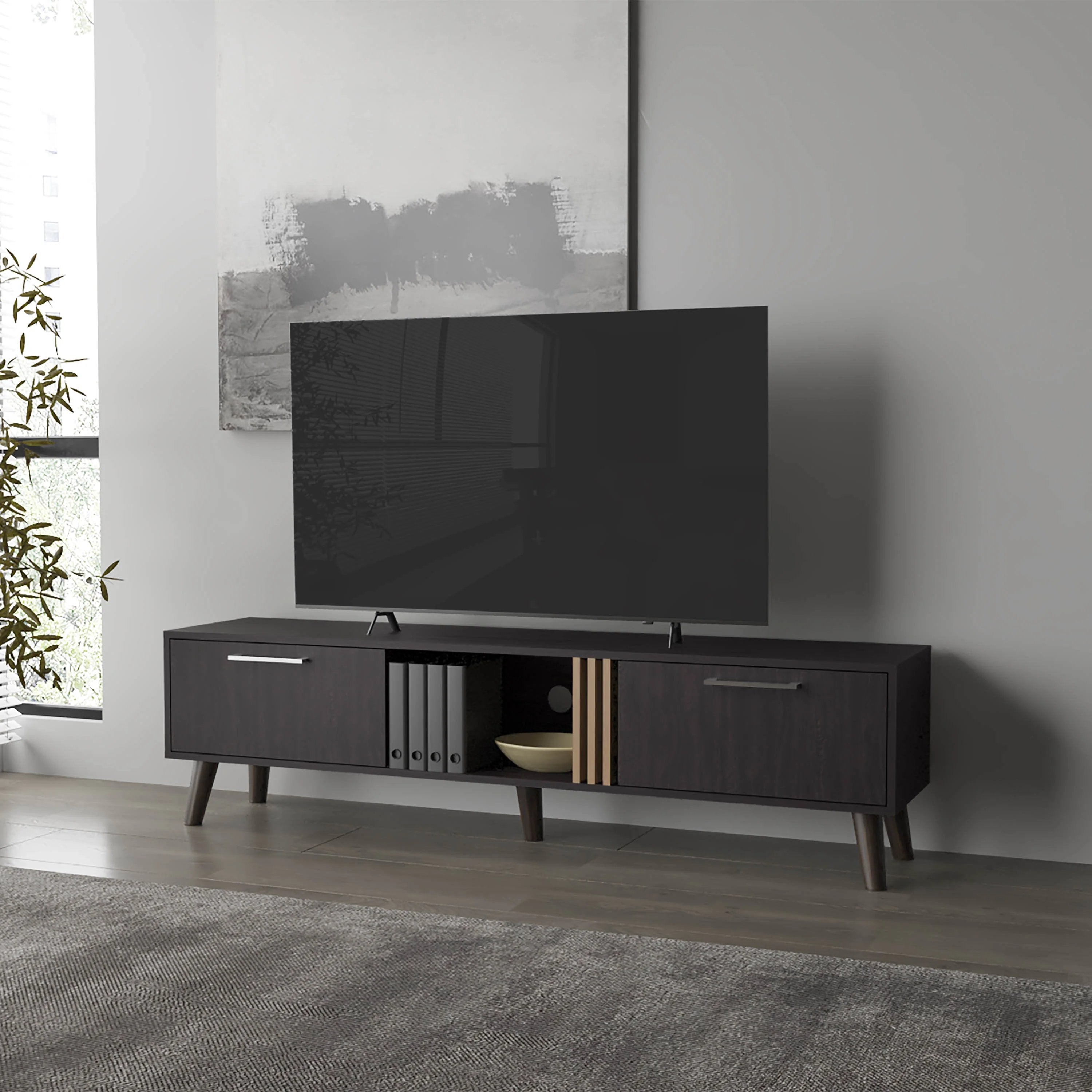 Bring modern elegance and practical storage to your media area with this Wengue-finished TV stand. Its deep, sophisticated wood tone and clean rectangular silhouette create a refined focal point while the smartly arranged shelving and doors keep electronics, media, and accessories organized and accessible.