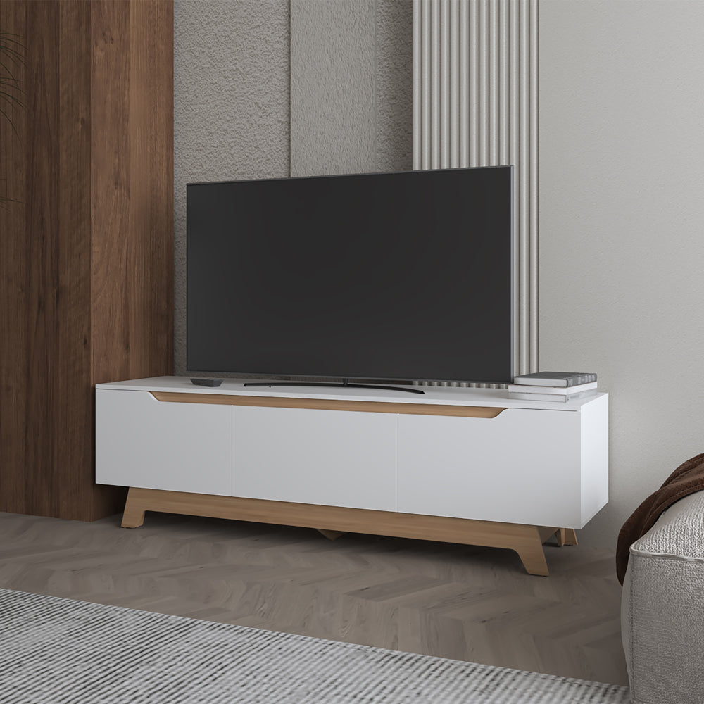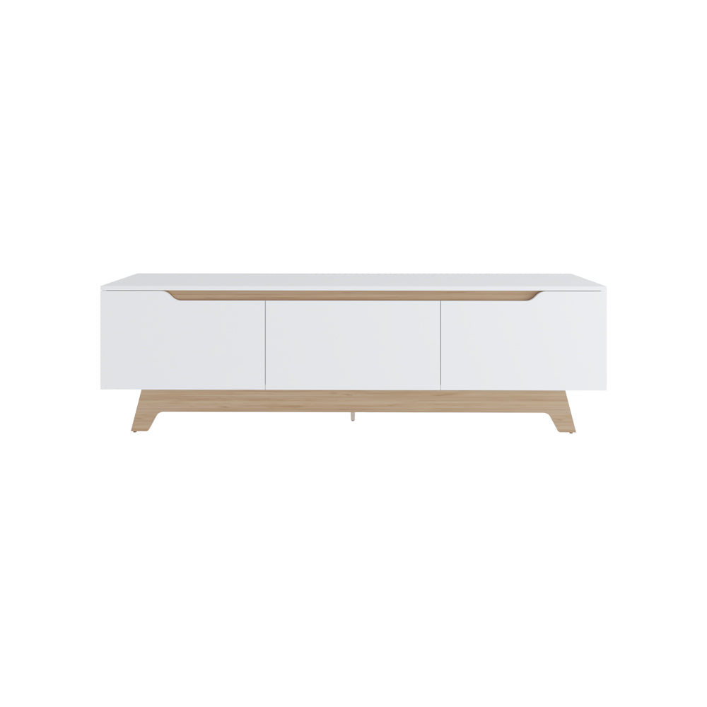Bring a clean, contemporary look to your living room with the Yukon TV stand. Its crisp white and macadamia finish pairs mid-century warmth with modern minimalism, creating a versatile centerpiece for media setups, gaming consoles, or decorative displays. Built from durable engineered wood, the cabinet offers concealed storage to keep components organized while maintaining a streamlined silhouette that complements a variety of interiors.