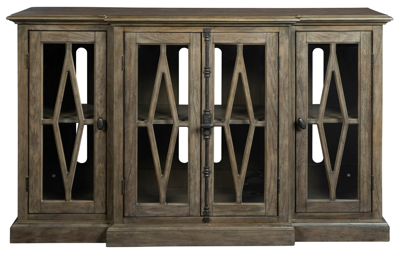 - • Select veneers and solids. • Breakfront style cabinet features four glass doors with diamond-shaped frets. • A gun bolt latch secures the center doors. • Adjustable shelf behind center doors, and one each behind the left and right doors. • Antique brass hardware. • Power pack included in the lower center. • Special Reserve finish. • Floor levelers.