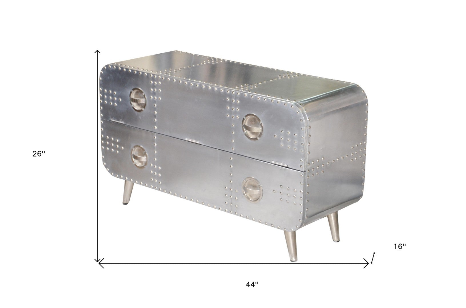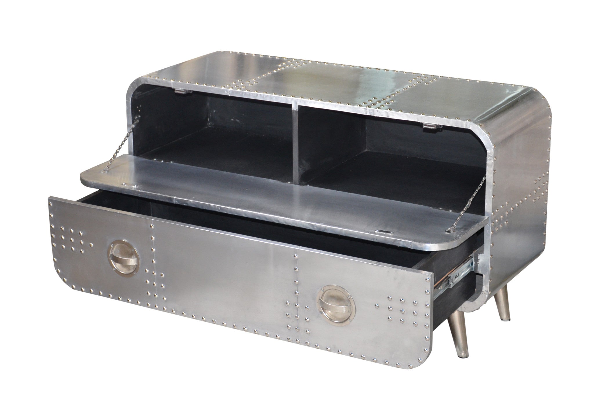 - Aviator industrial style cabinet with patchwork aluminum and rivets for a unique design.