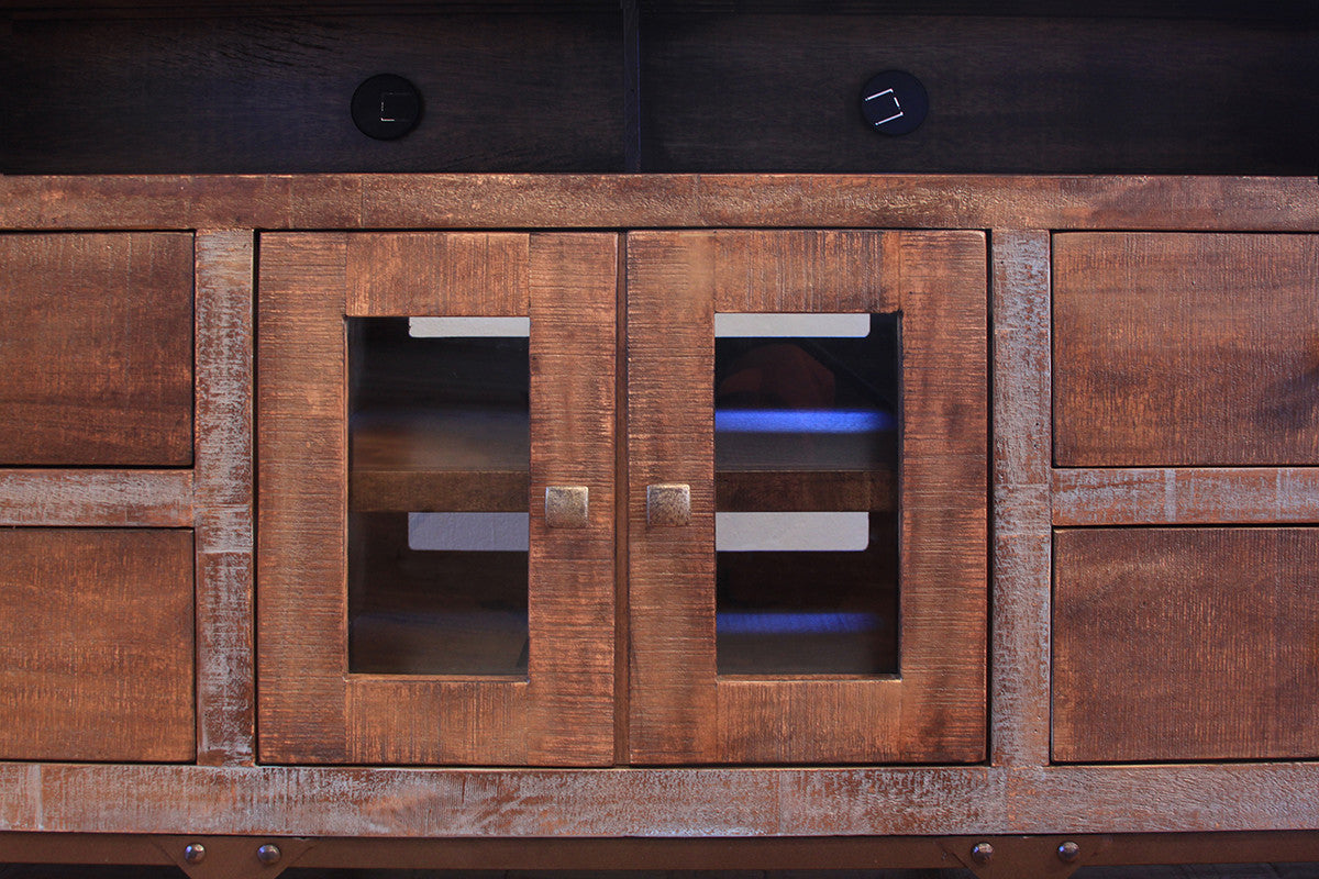 - 62" TV Stand perfect for reduced spaces. Holds most medium-sized TVs. The top open area is designed to fit popular sound bar systems. Fixed shelf behind glass doors, two removable shelves one behind each wood door.