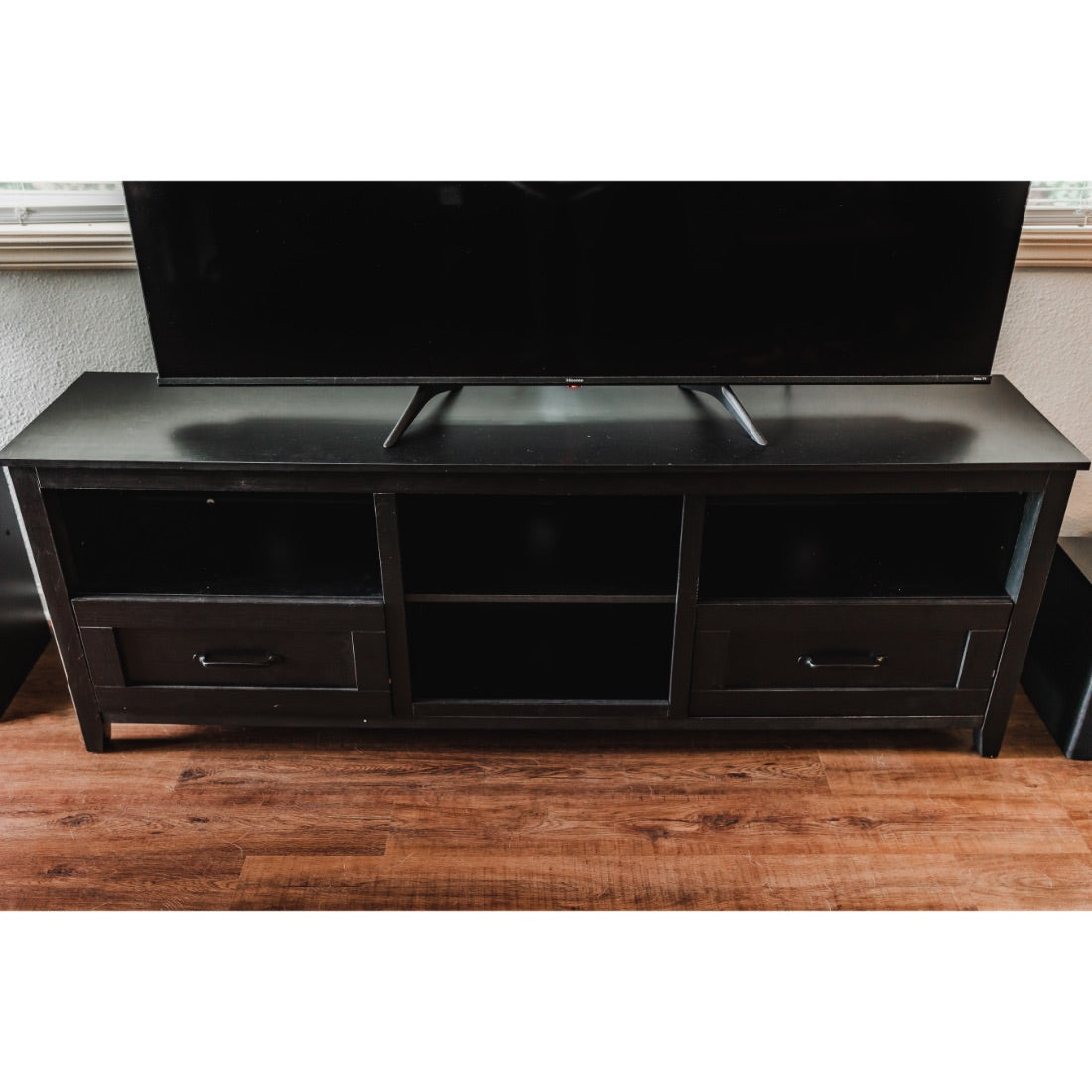 - This farmhouse TV stand with 4 open storage shelves offer great space for you to keep your entertainment equipment.