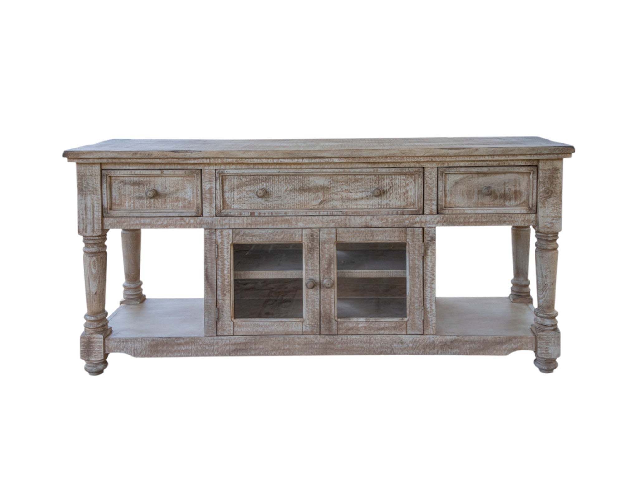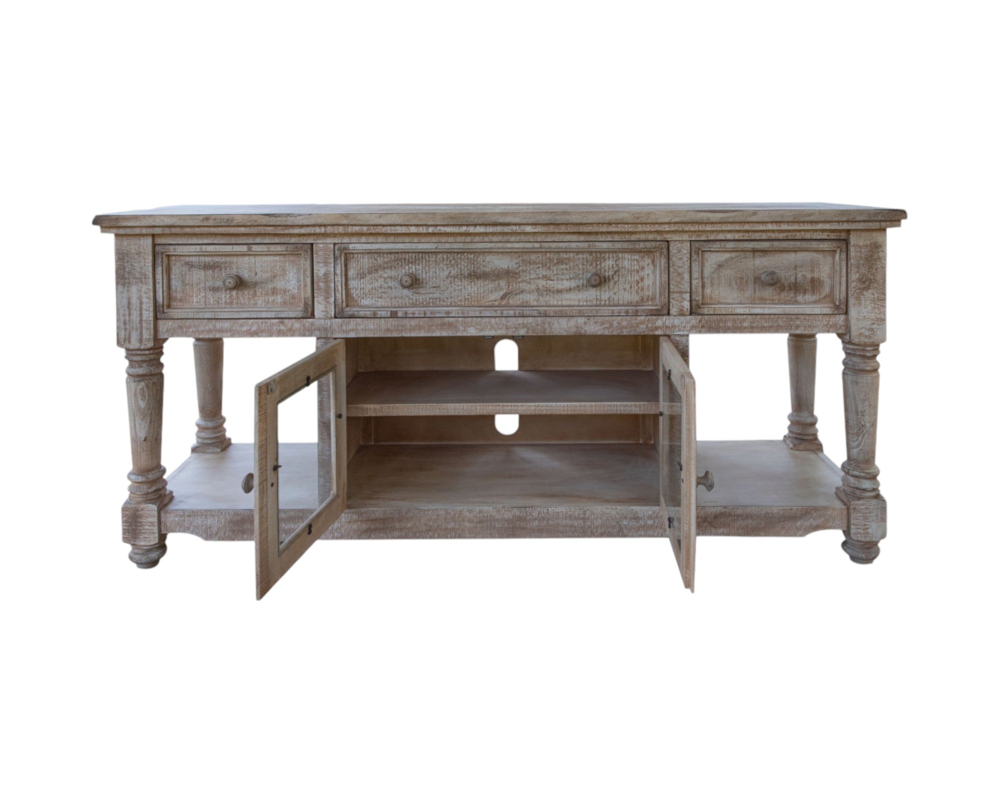 - TV stand features wire management on the back panel and one fixed shelf across.