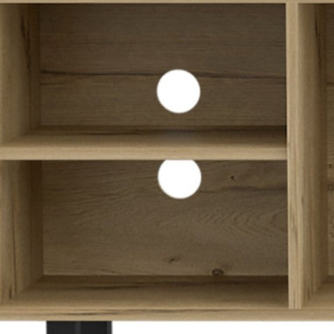 - Features manufactured wood in a natural colored faux wood finish with black accents.