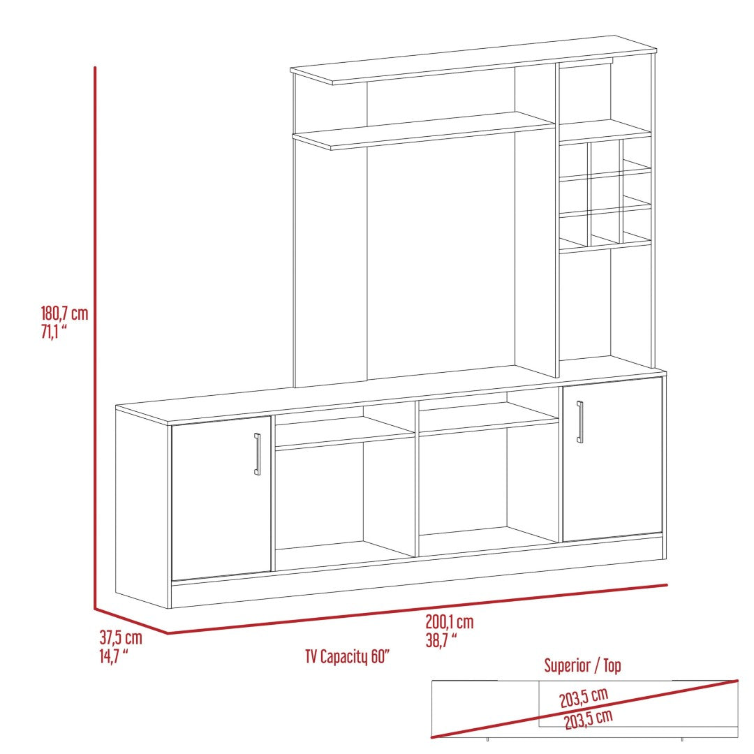 - A versatile entertainment center that features lots of open cubby space including space for bar storage and wine bottles.