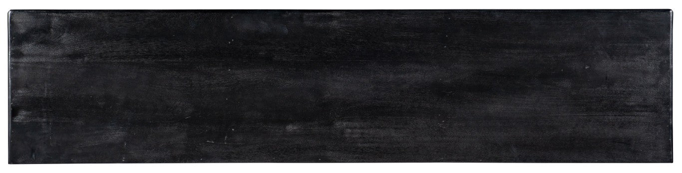 This striking entertainment console blends modern elegance with rustic charm, creating a focal point for your living room while offering practical storage and media organization. Rich black mango wood, hammered gold metal hardware, and a gold-finished iron base give it visual contrast and durability. Thoughtful features like ventilated cable access and removable shelving make it easy to accommodate components for a clean, organized setup that supports large TVs.