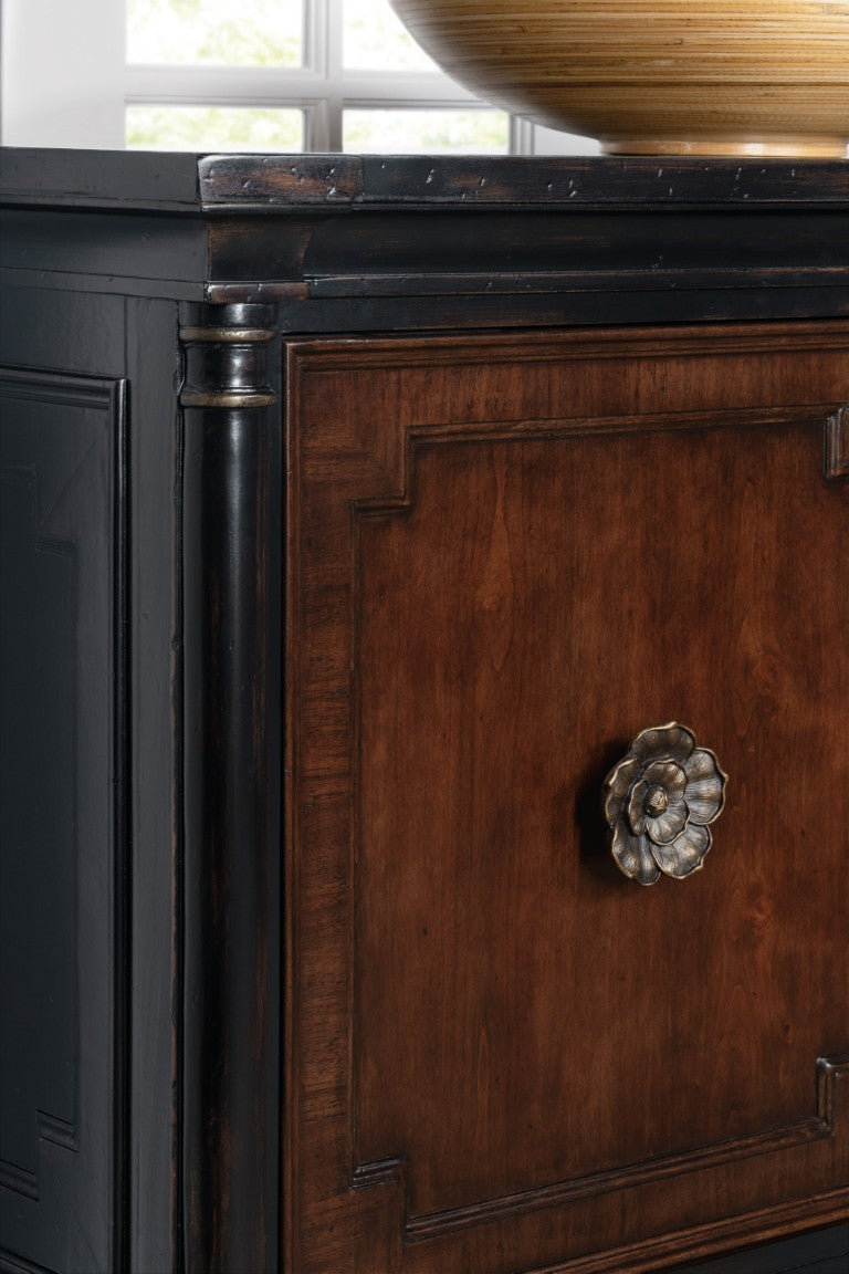 - Exterior: Black Cherry: this finish emulates the vibrancy of the warm cherry finish shining from beneath the Black Cherry patina and includes subtle distressing which exemplifies the heirloom nature of the collection. Handpainted accents on the drop-front. Door fronts: Maraschino Cherry: finished using natural grain Cherry veneers showcasing the dramatic cathedral structure with the selective inclusion of naturally occurring knots to deliver a rich warm cherry finish and a smooth sophisticated aesthetic.