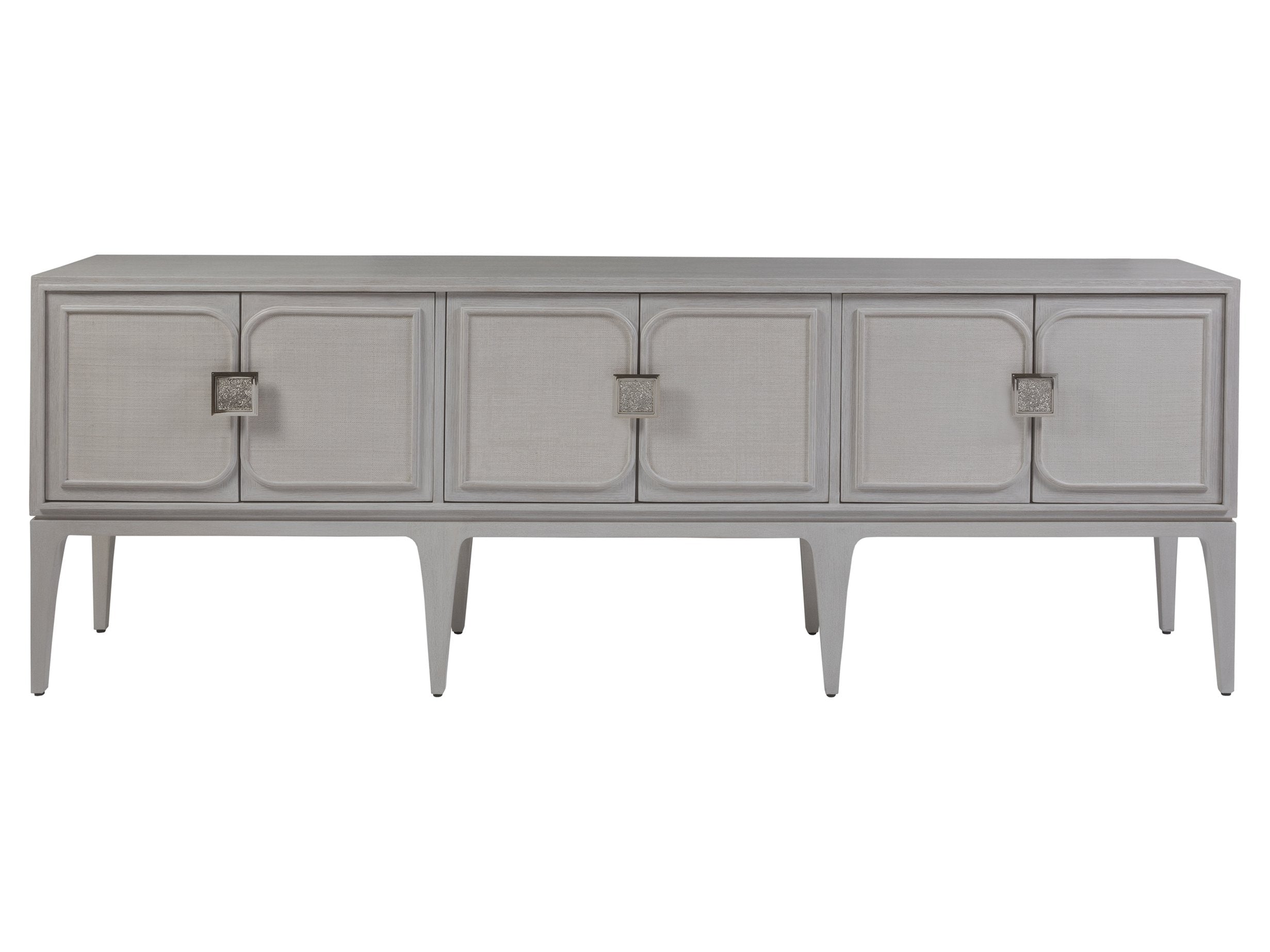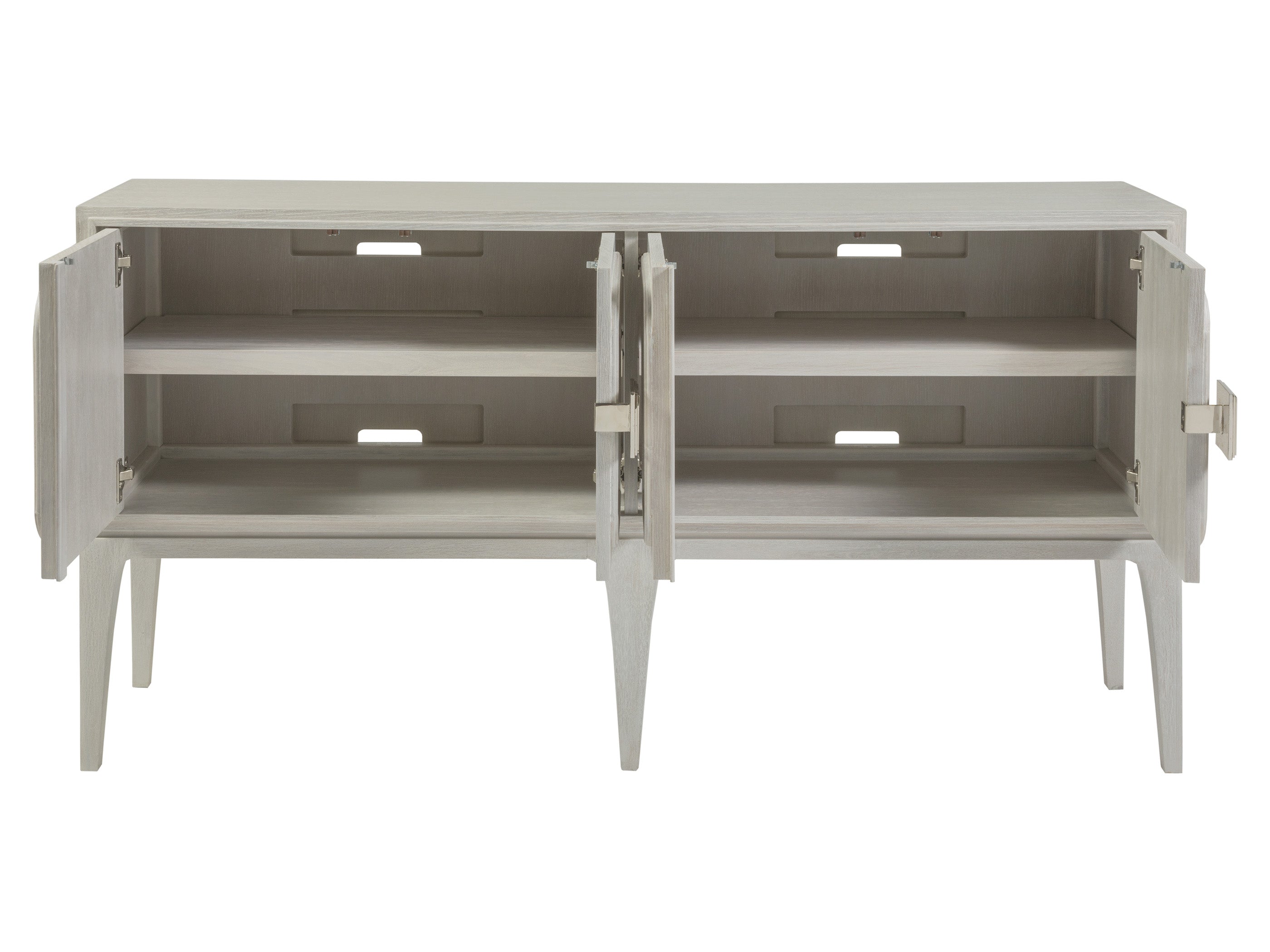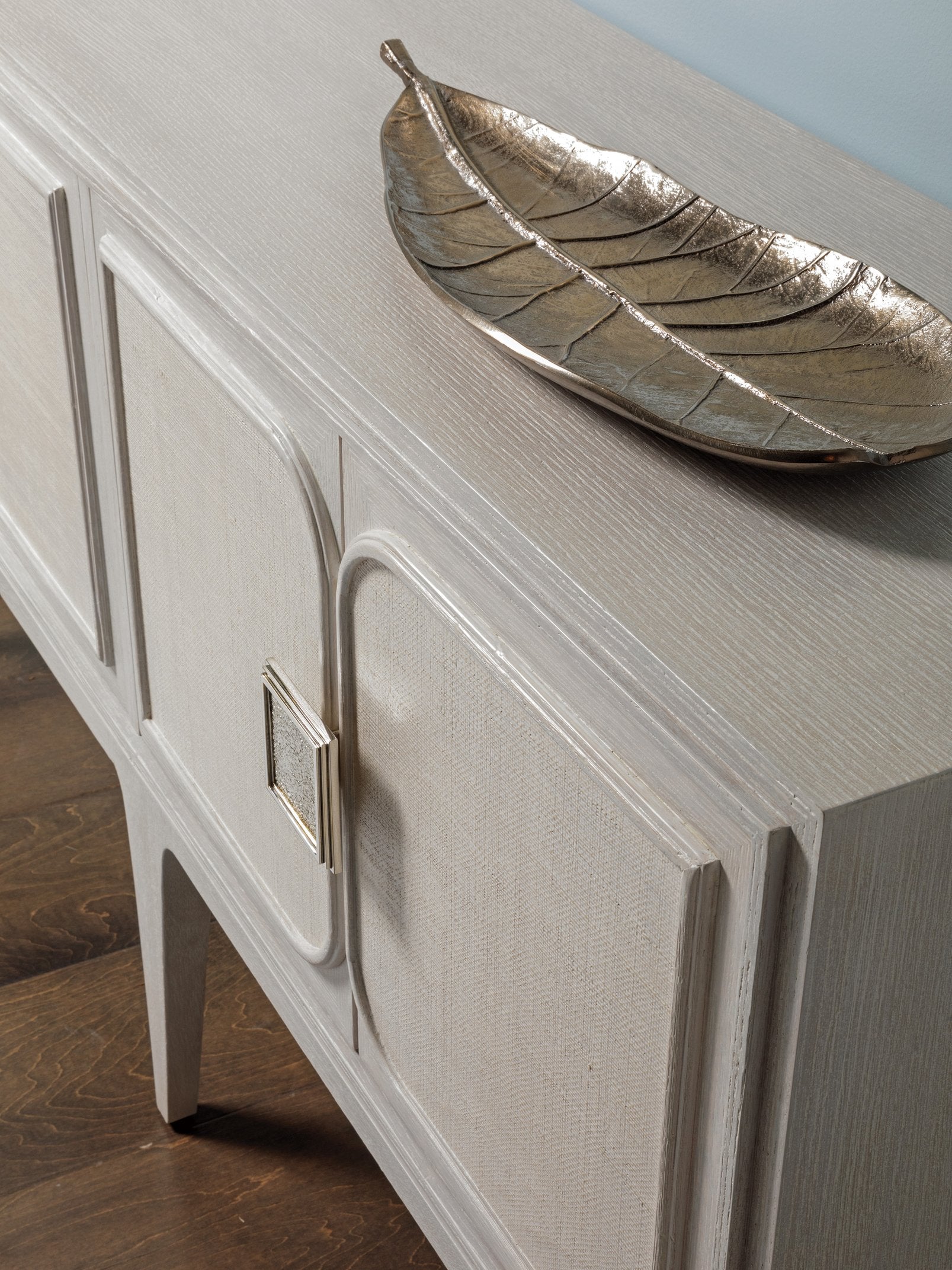 Elevate your living space with the Elixer Media Console, a stunning piece that seamlessly blends functionality and style. Crafted by Artistica Home's Signature Designs, this media console showcases a perfect blend of transitional aesthetics and unique materials. The elegant combination of deeply sandblasted quartered oak veneers and raffia door panels in a soft misty white gray finish creates a captivating focal point for any room. With its luxurious silver leaf brass hardware, this console not only serves as a practical storage solution but also enhances your home decor with sophistication.