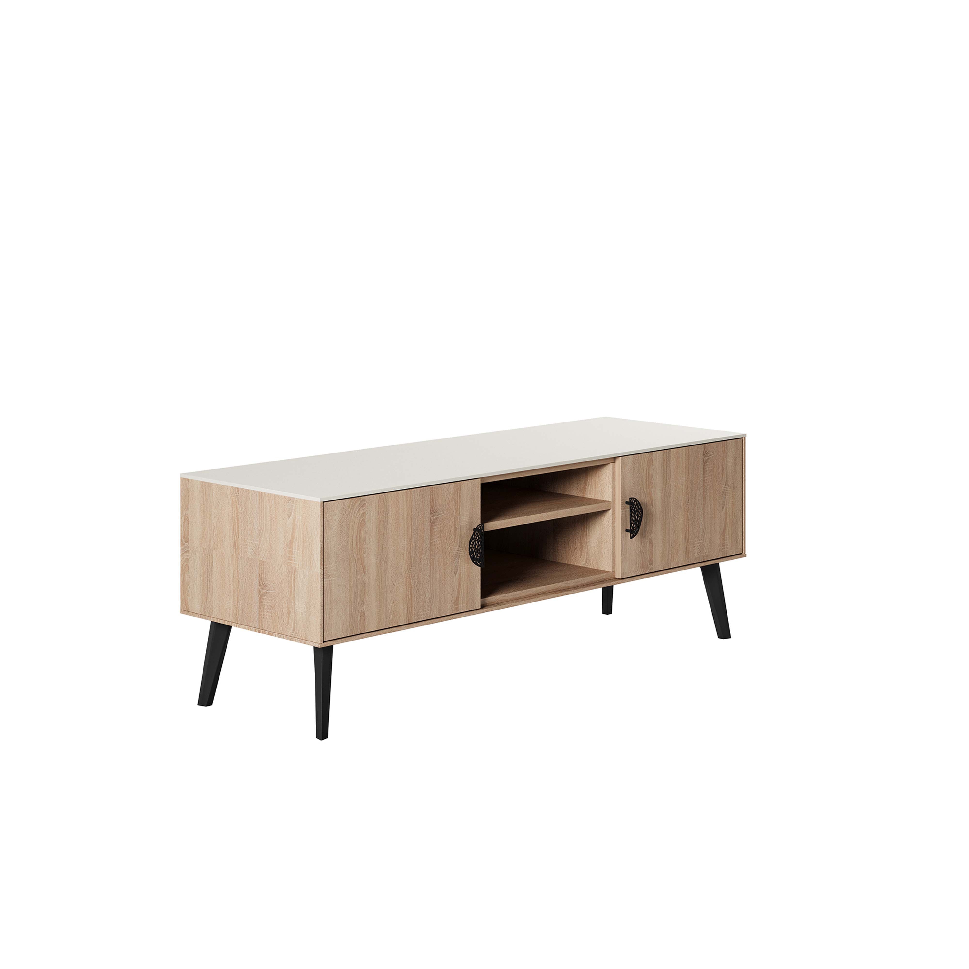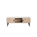 Immerse yourself in the captivating allure of the Haley Collection, a symphony of Mid-Century Modern elegance and functionality. Light neutral tones and the gentle embrace of wood grain elevate each piece, inviting you to indulge in its timeless beauty. Picture yourself surrounded by the seamless integration of style and space-saving design, as every detail whispers tales of enduring sophistication. Transform your living space into a haven of unparalleled elegance with the Haley Collection, where every element harmonizes to create a sanctuary of beauty and grace.- Mid-Century Modern TV Stand for Living Room Use.