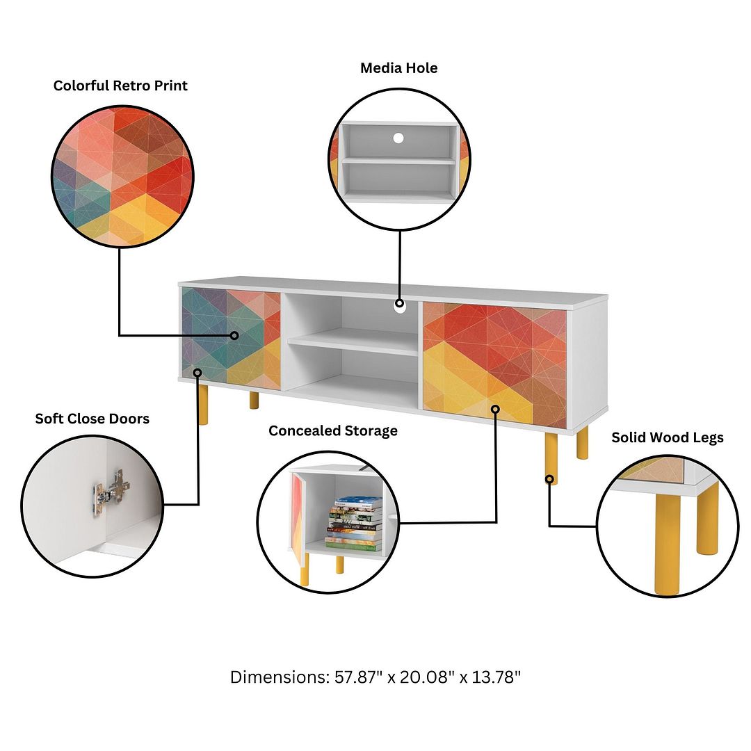 Description for TV-315AMC132 Manhattan Comfort Mid-Century Modern Retro 57.87 TV Stand with 4 in White and Multi Red, Yellow, Blue Print