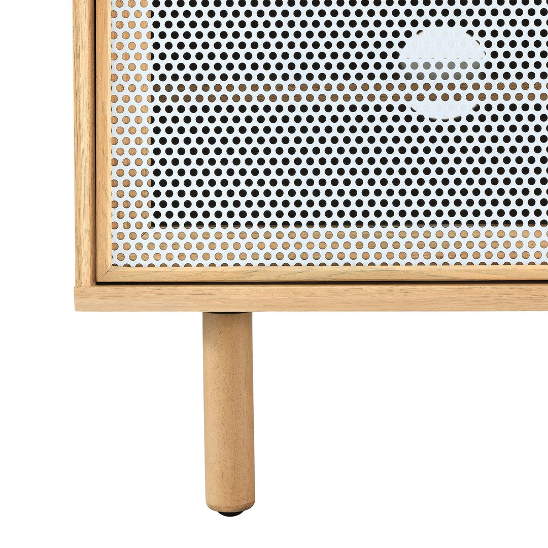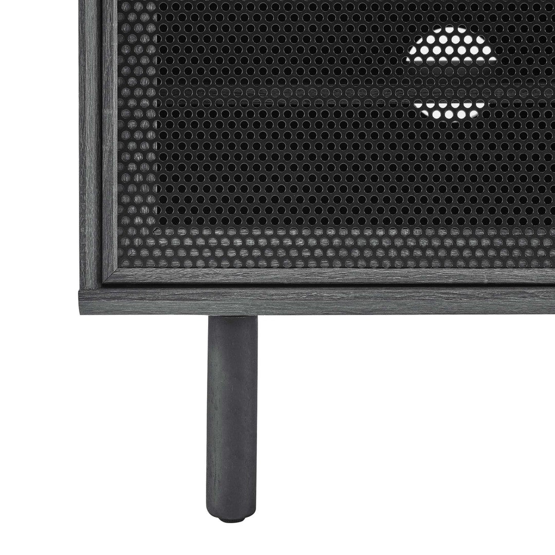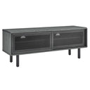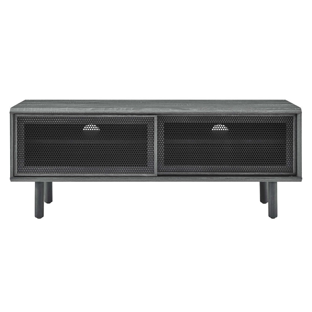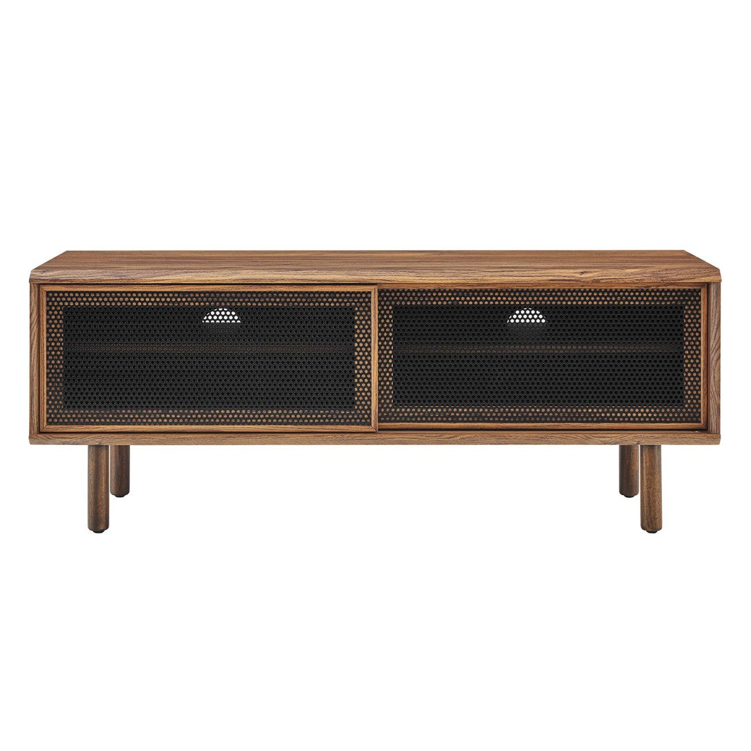 - Modern Urban TV Stand Metal Mesh Sliding Doors MDF and Particleboard Cable Management Holes Wood Legs Non-Marking Foot Pads Weight Capacity: 137 lbs.