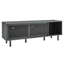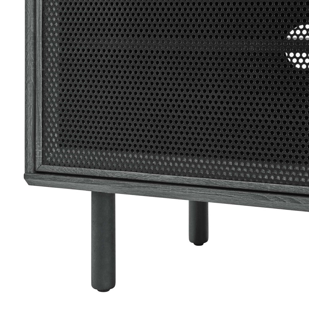 - Modern TV and Record Stand Metal Mesh Sliding Doors MDF and Particleboard Cable Management Holes Sturdy Wood Legs Non-Marking Foot Pads Weight Capacity: 200 lbs.