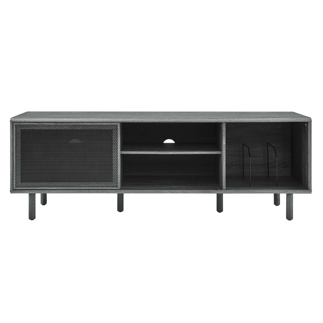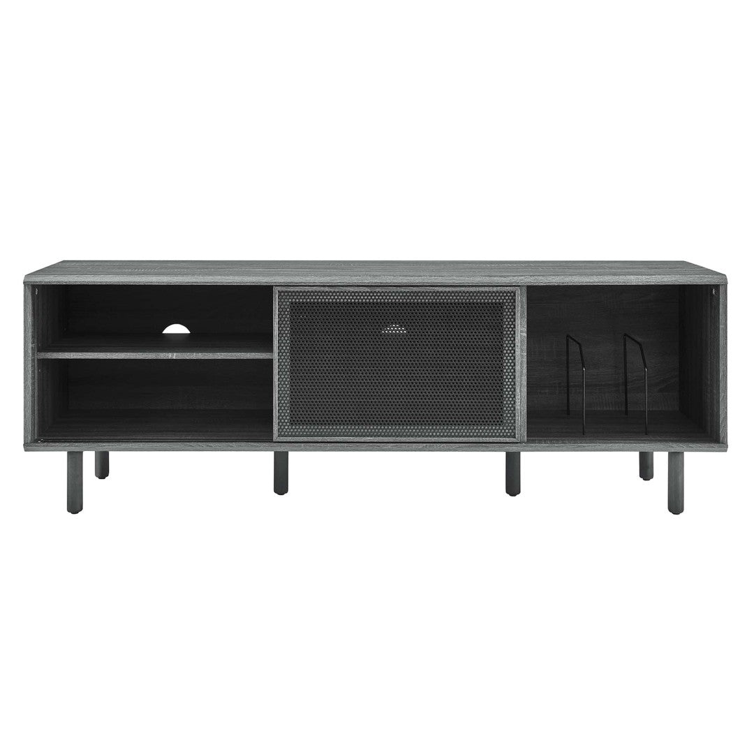 Bring industrial-chic organization and stylish media display to your home with a low-profile console that pairs a natural wood-grain finish with metal mesh sliding doors and dedicated vinyl storage. The Kurtis stand is designed to showcase a flat-screen TV while keeping components, records, and accessories neatly organized and ventilated — perfect for living rooms, bedrooms, home offices, and lounge areas that favor modern urban design.