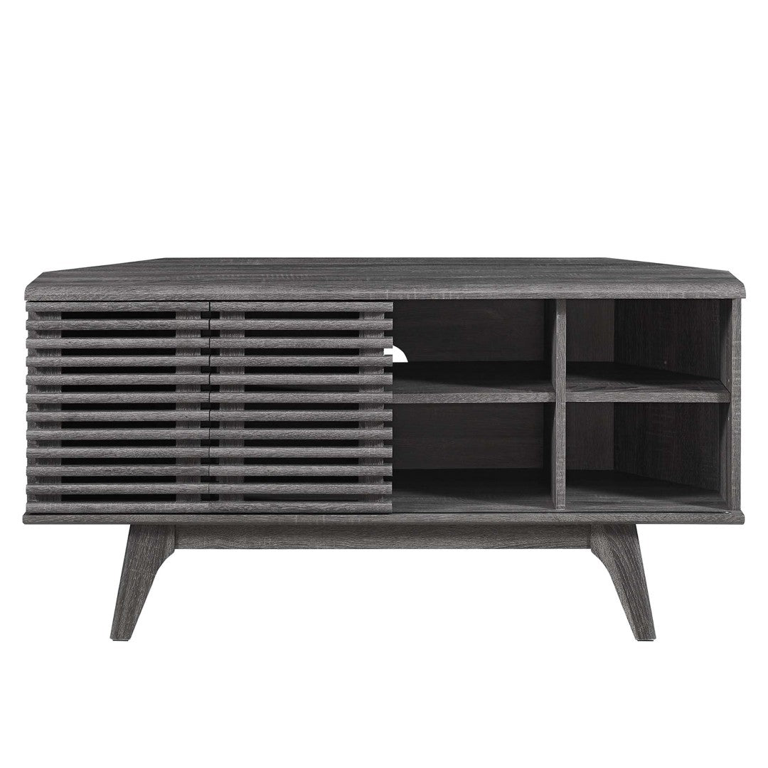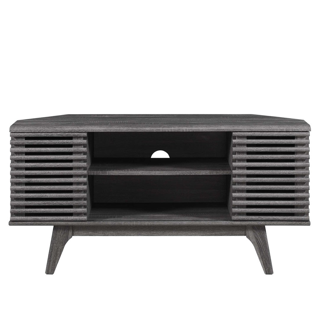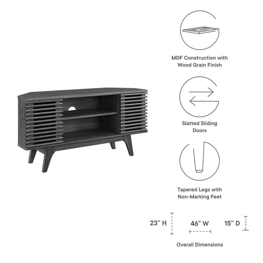- Mid-Century Modern Corner TV Stand Modern TV Stand For TVs up to 50" Smooth Wood Grain Laminate Durable Particleboard Construction Sliding Doors Adjustable Shelves Assembly Required
