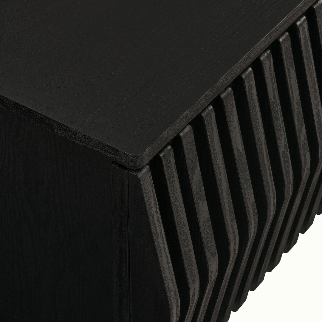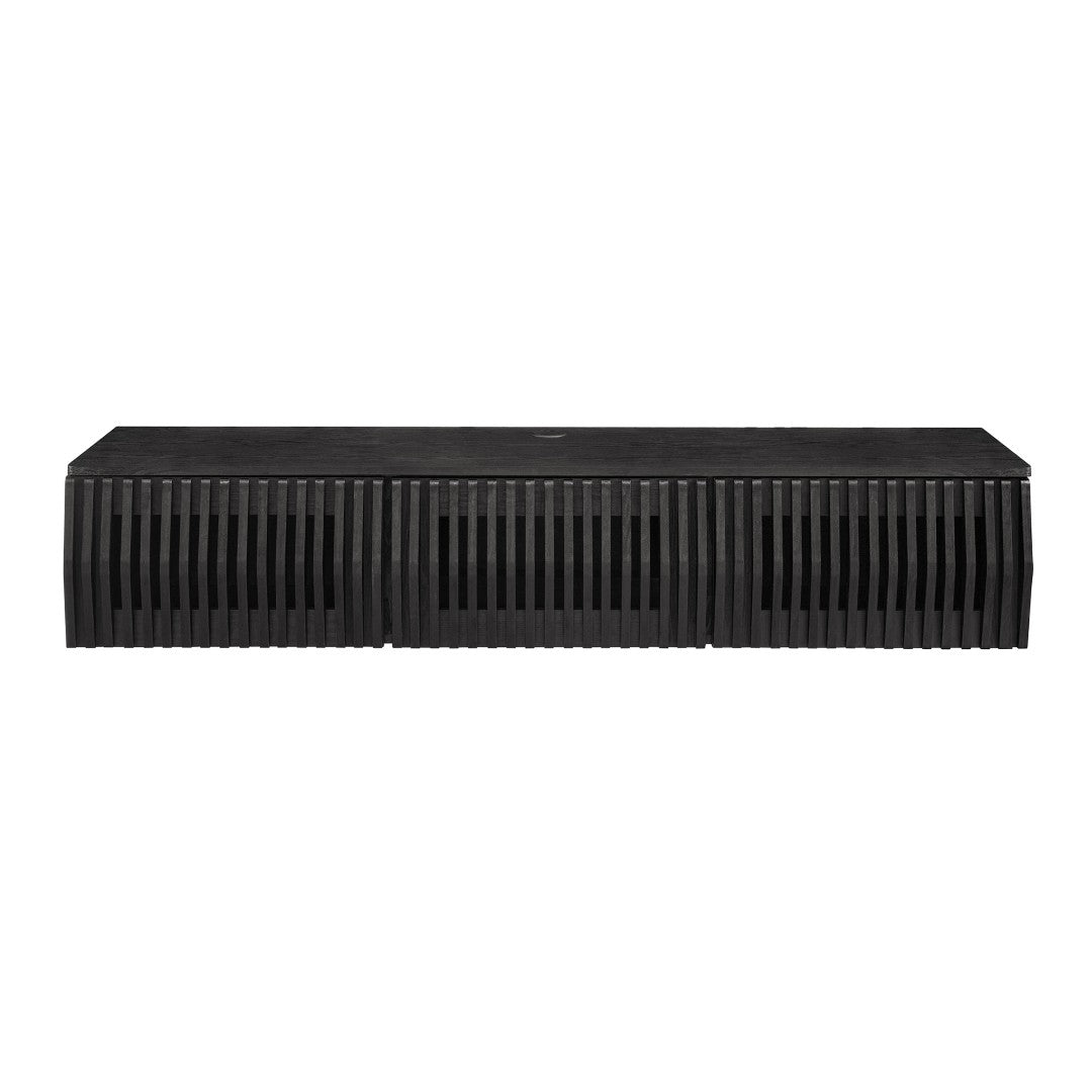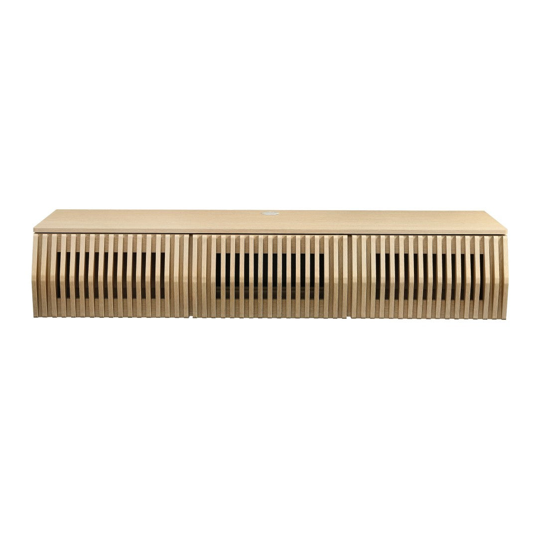 - Concealed storage: Three drop-down doors with vertical slat fronts hide media players, remotes, and accessories
