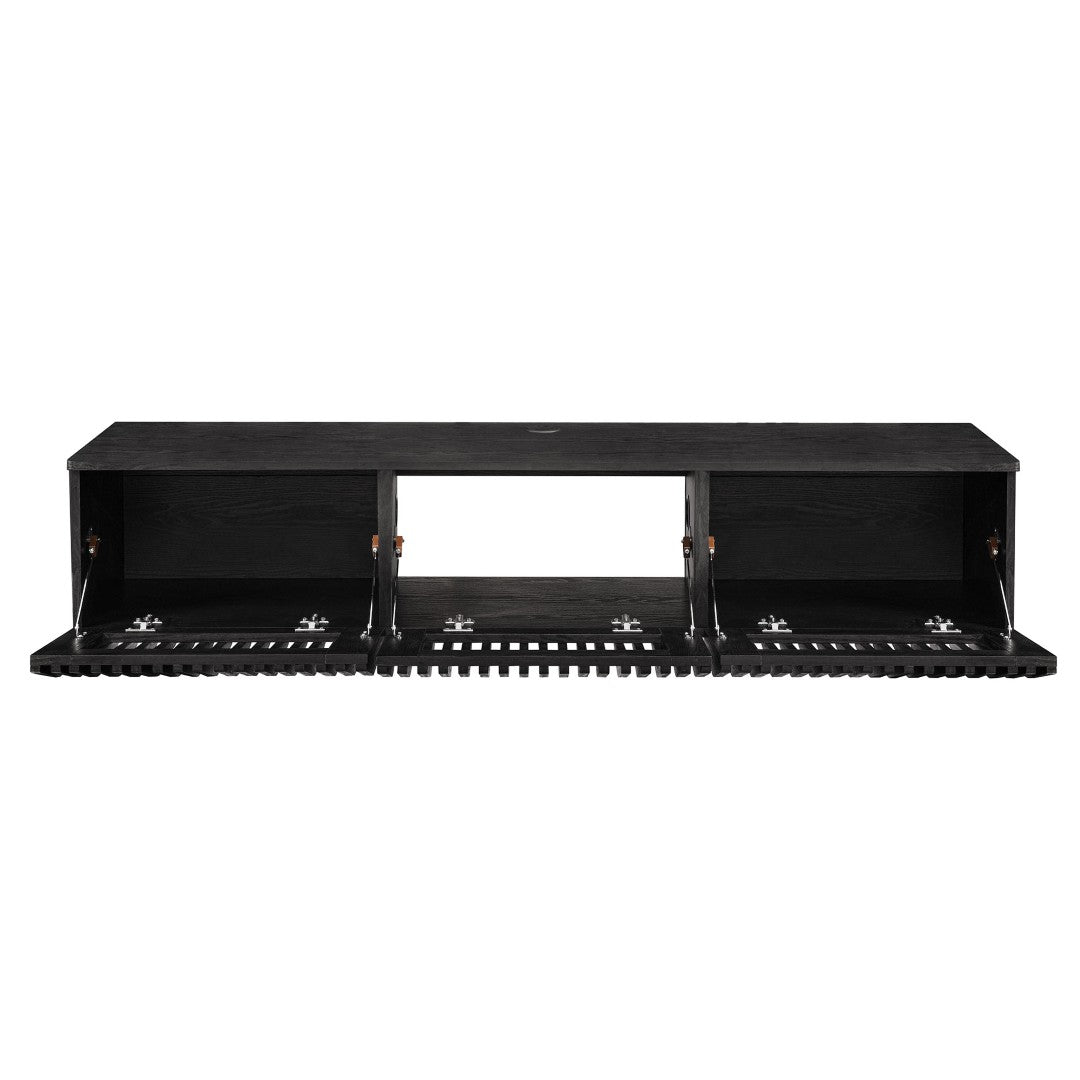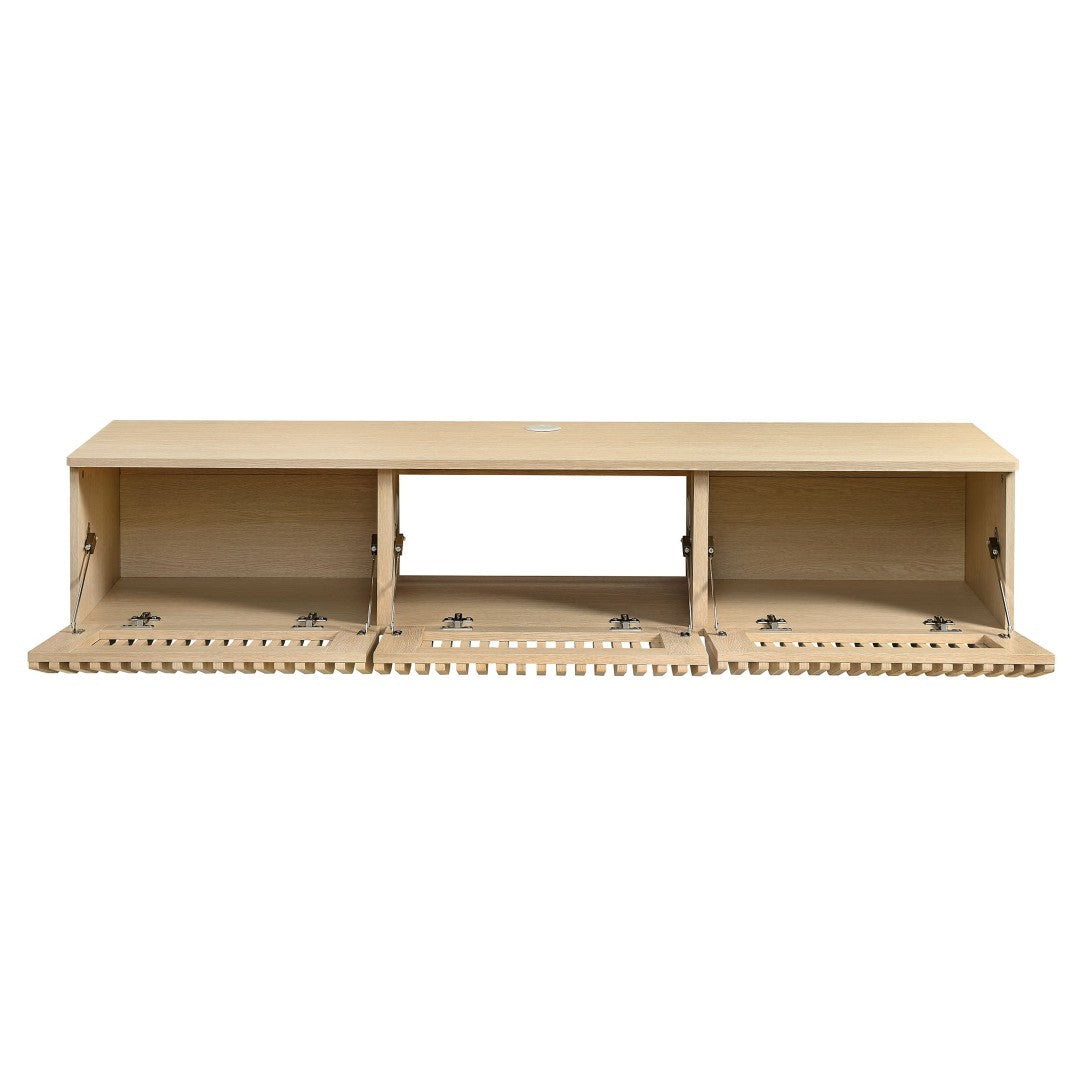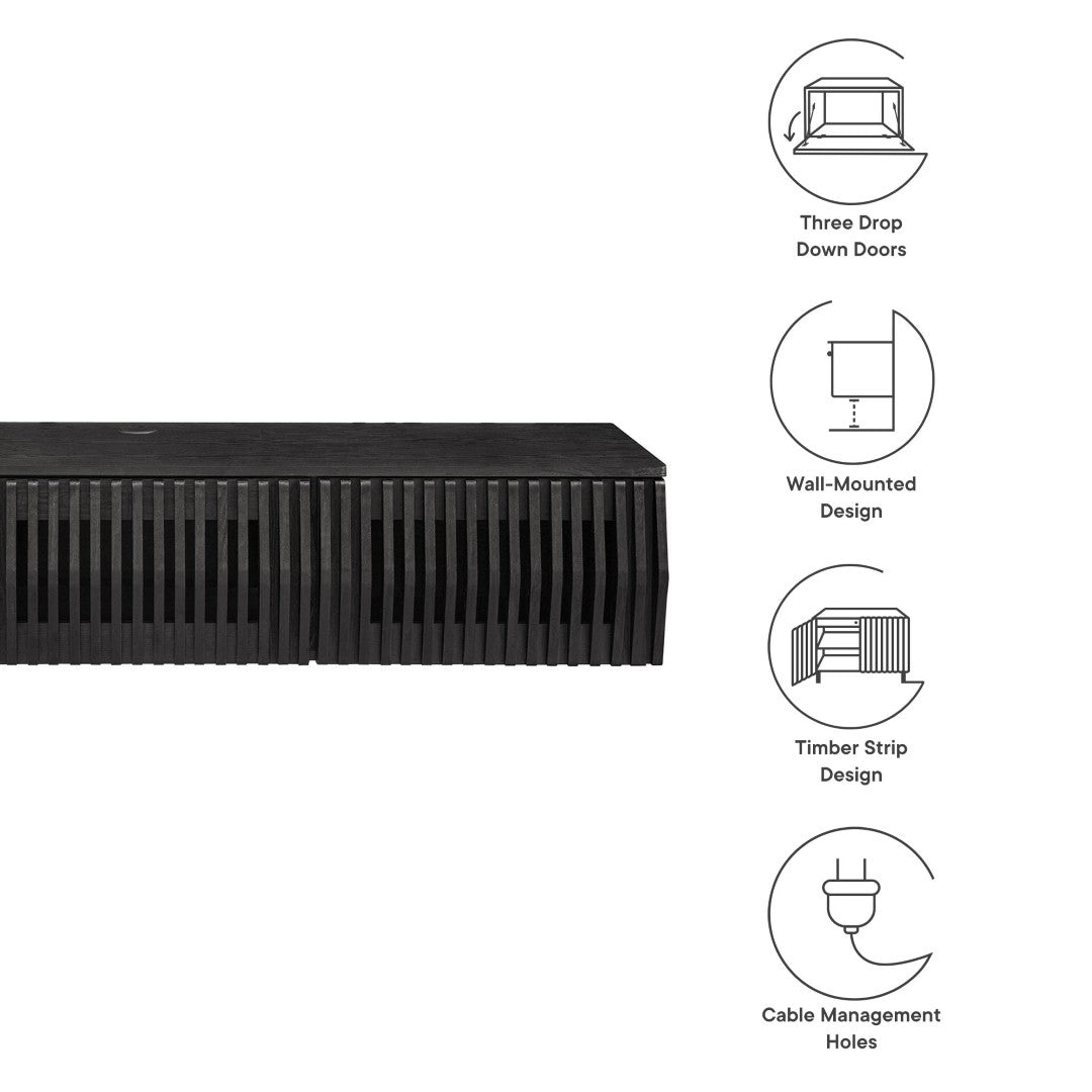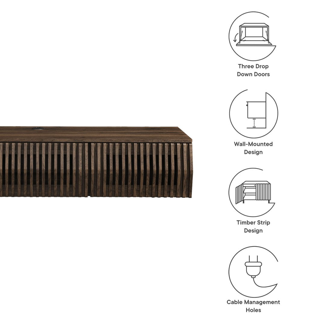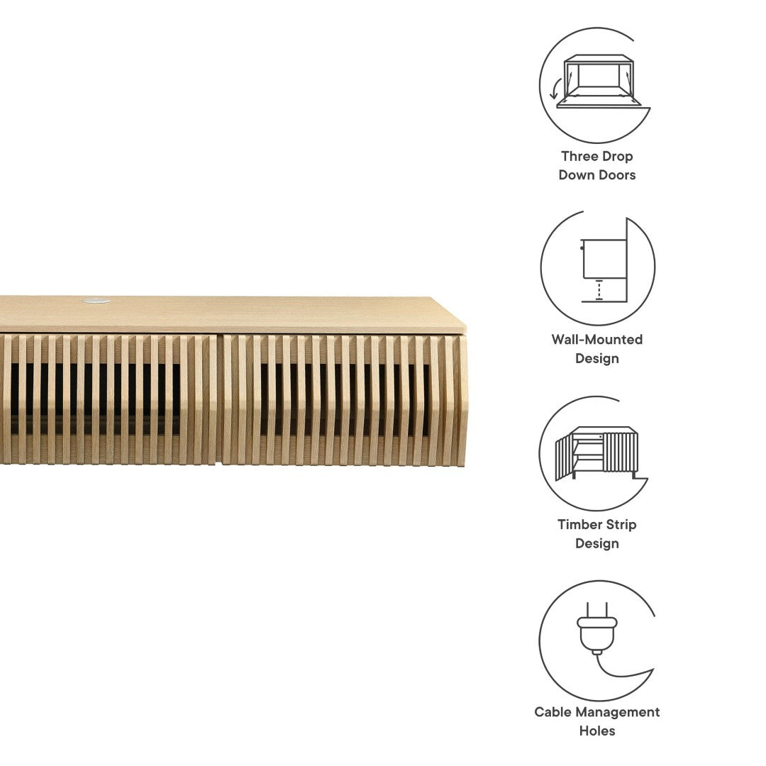 - 64" Wall Mounted TV Stand Laminate Finish Timber Strip Design 3 Drop Down Doors Cable Management Holes Assembly Required