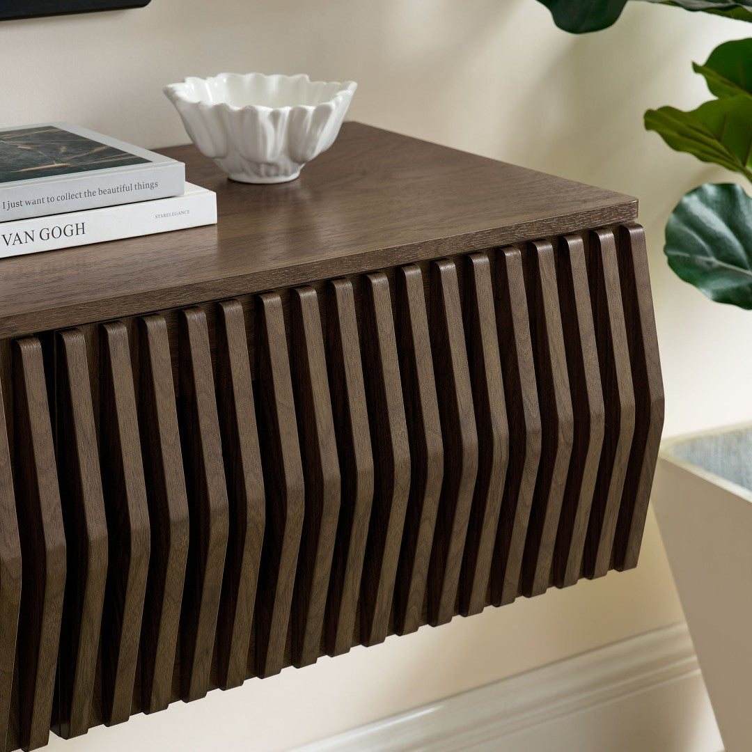Elevate your entertainment area with the Vaughn wall-mounted TV stand — a minimalist, contemporary cabinet that blends clean design with smart storage. Finished in a smooth laminate and featuring vertical slatted fronts, this floating unit keeps cables and components out of sight while maintaining a sleek, modern profile. It’s ideal for living rooms, media rooms, or lounges where style and organization matter.