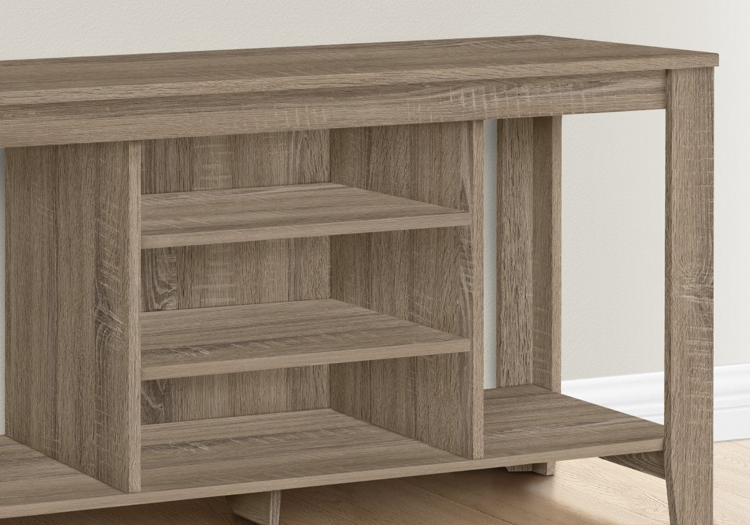- Thick panel wood look construction on all sides finished in espresso