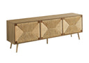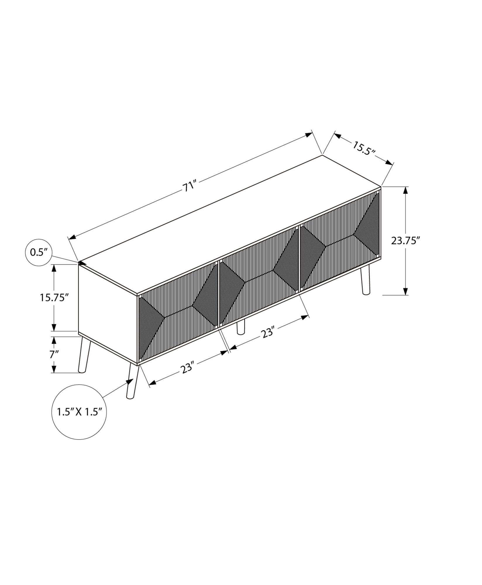 - With mid-century modern inspiration, this 72-inch long tv stand in a light walnut laminate finish and accented with natural seagrass material on the cabinet doors for a casually chic vibe.