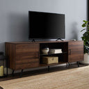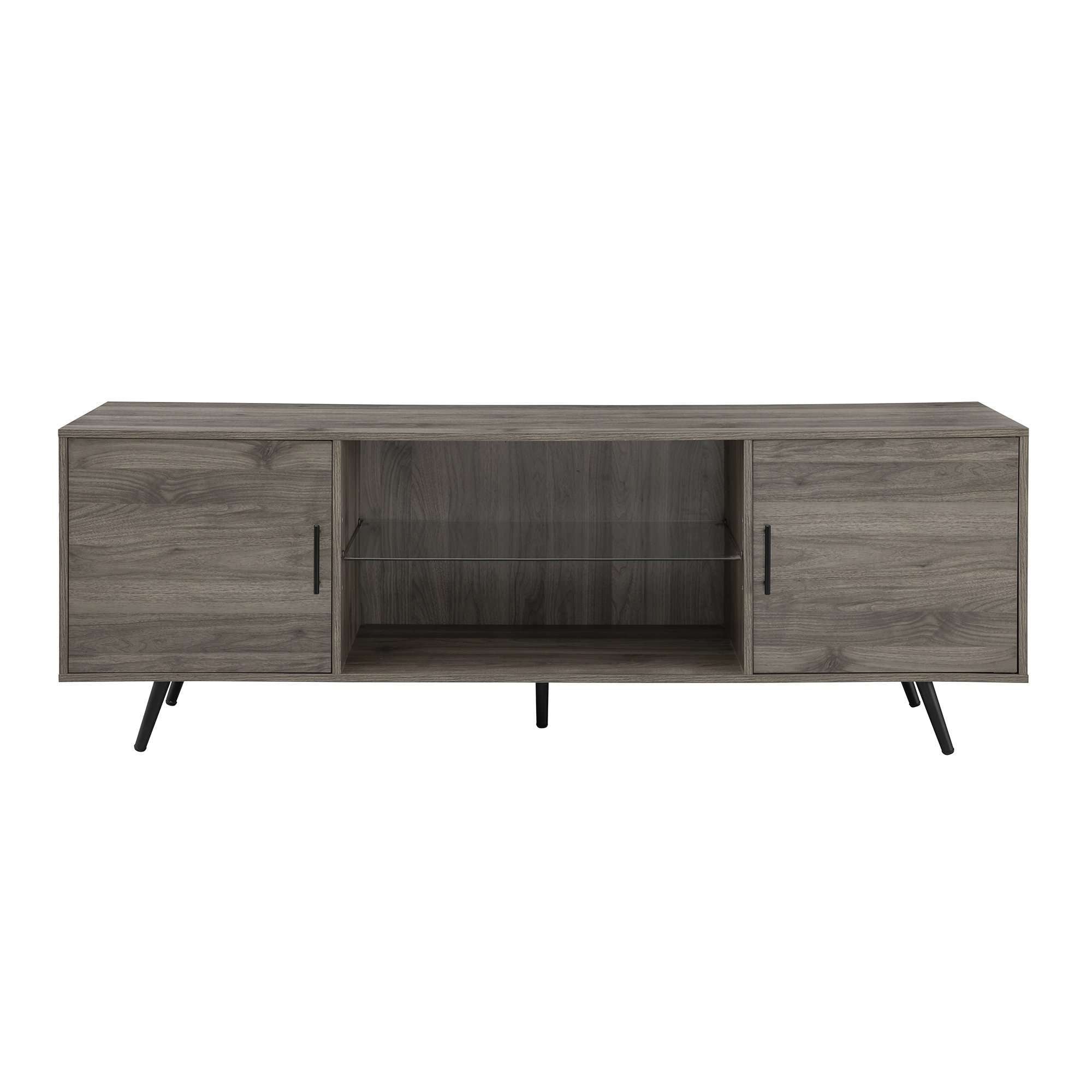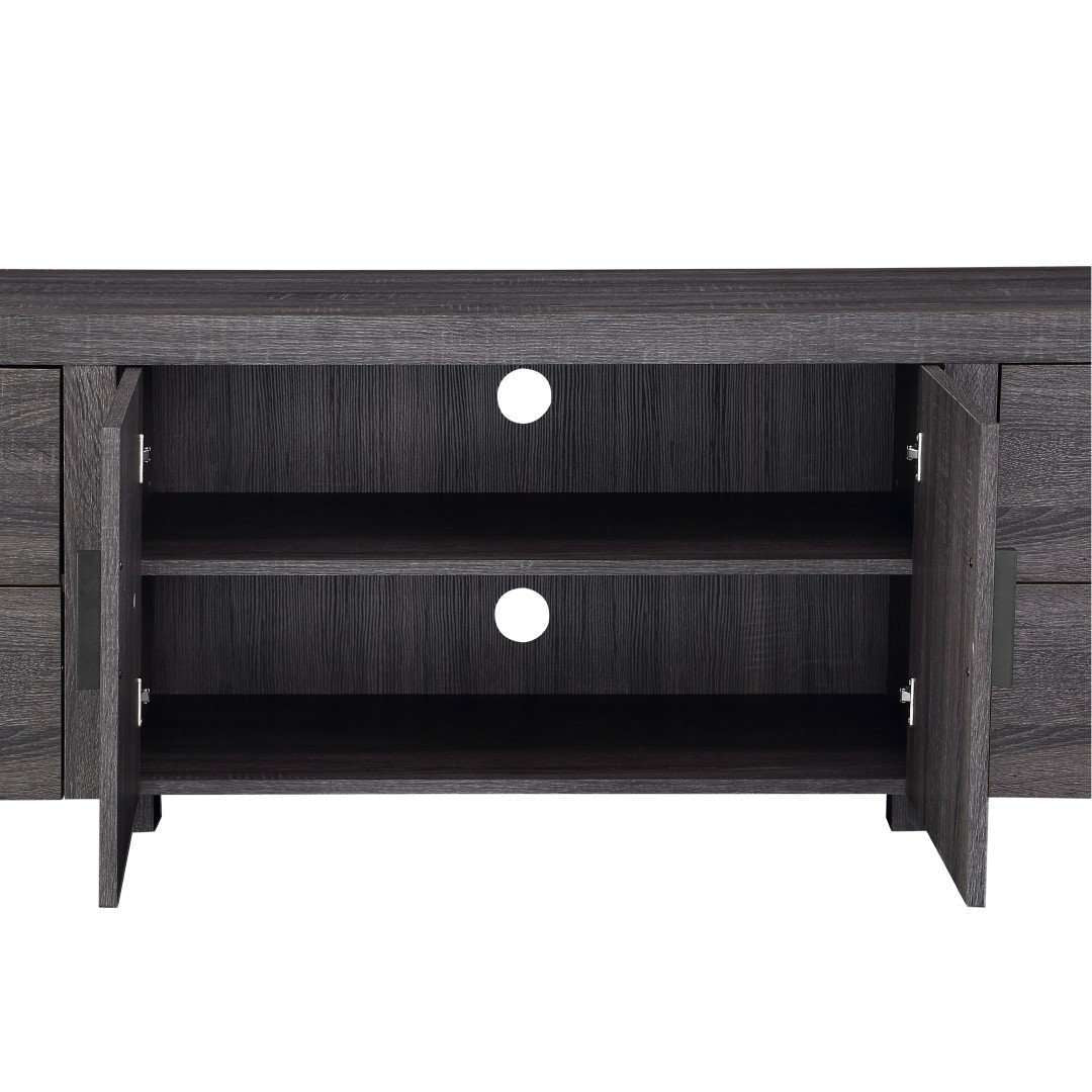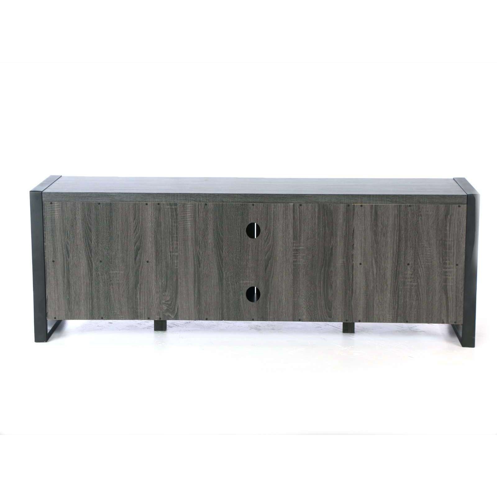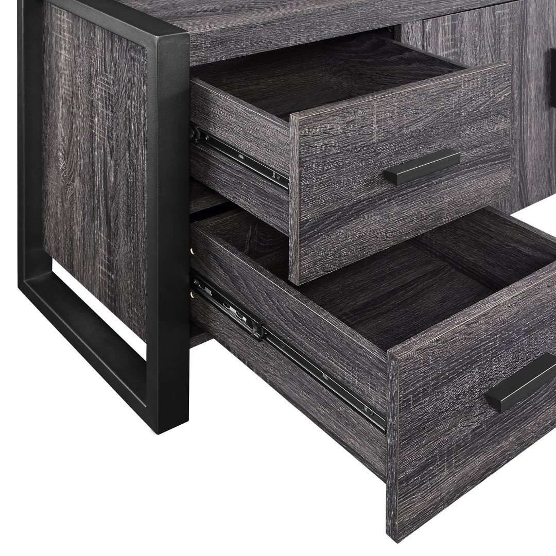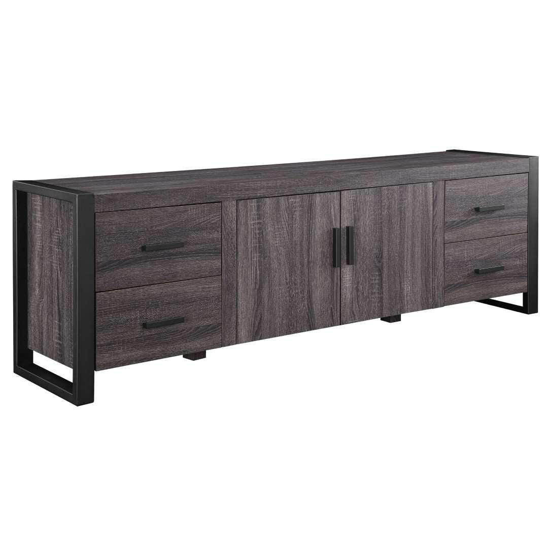 Design your ideal living room with style and storage in mind, with our TV stand. Featuring closed storage by having four side drawers and middle cabinet space, you’ll have plenty of room to keep your electronics and media inside. This entertainment center has metal side legs and handles to contrast against the durable laminate composition, giving it an urban industrial style. You’ll enjoy having a more organized living room with this console.