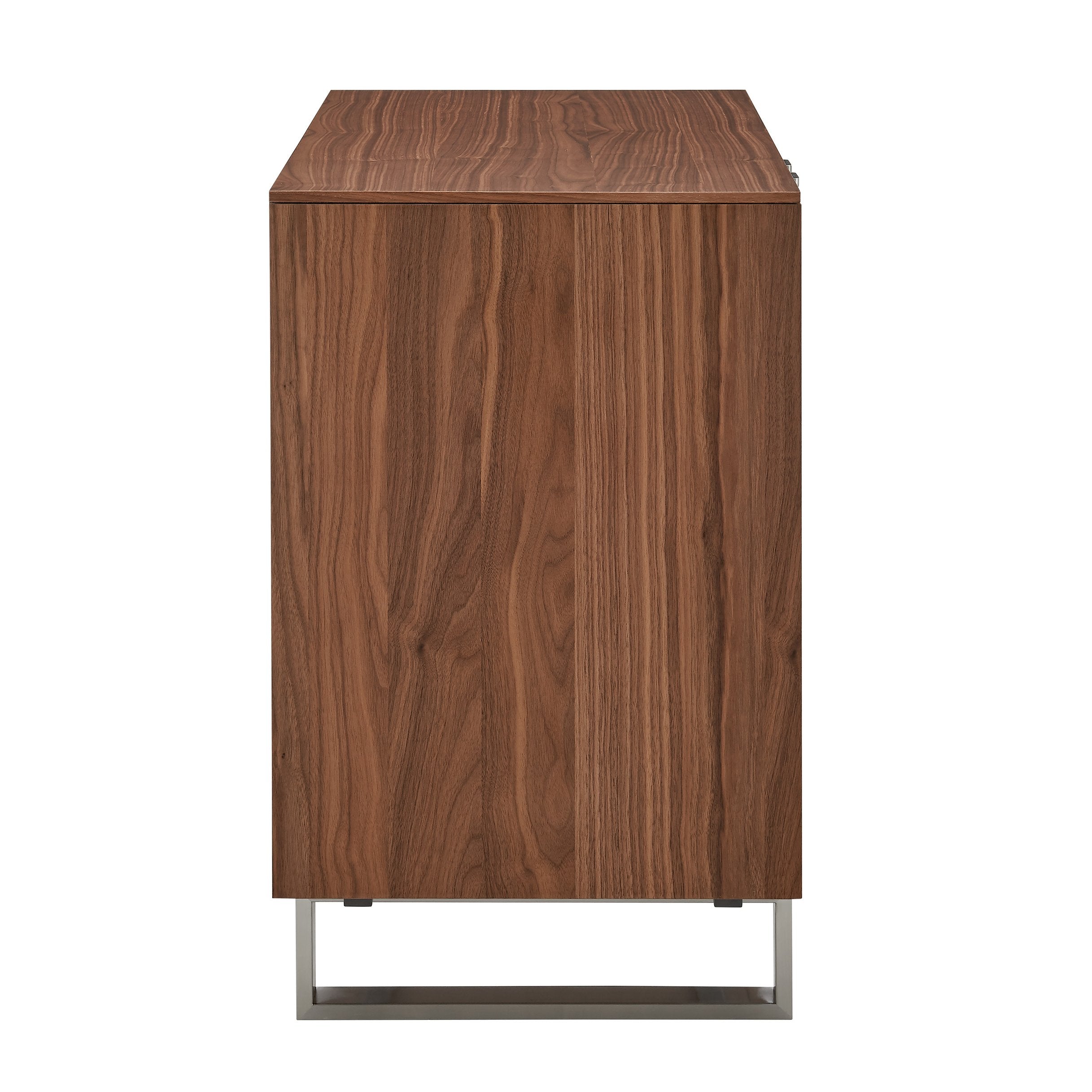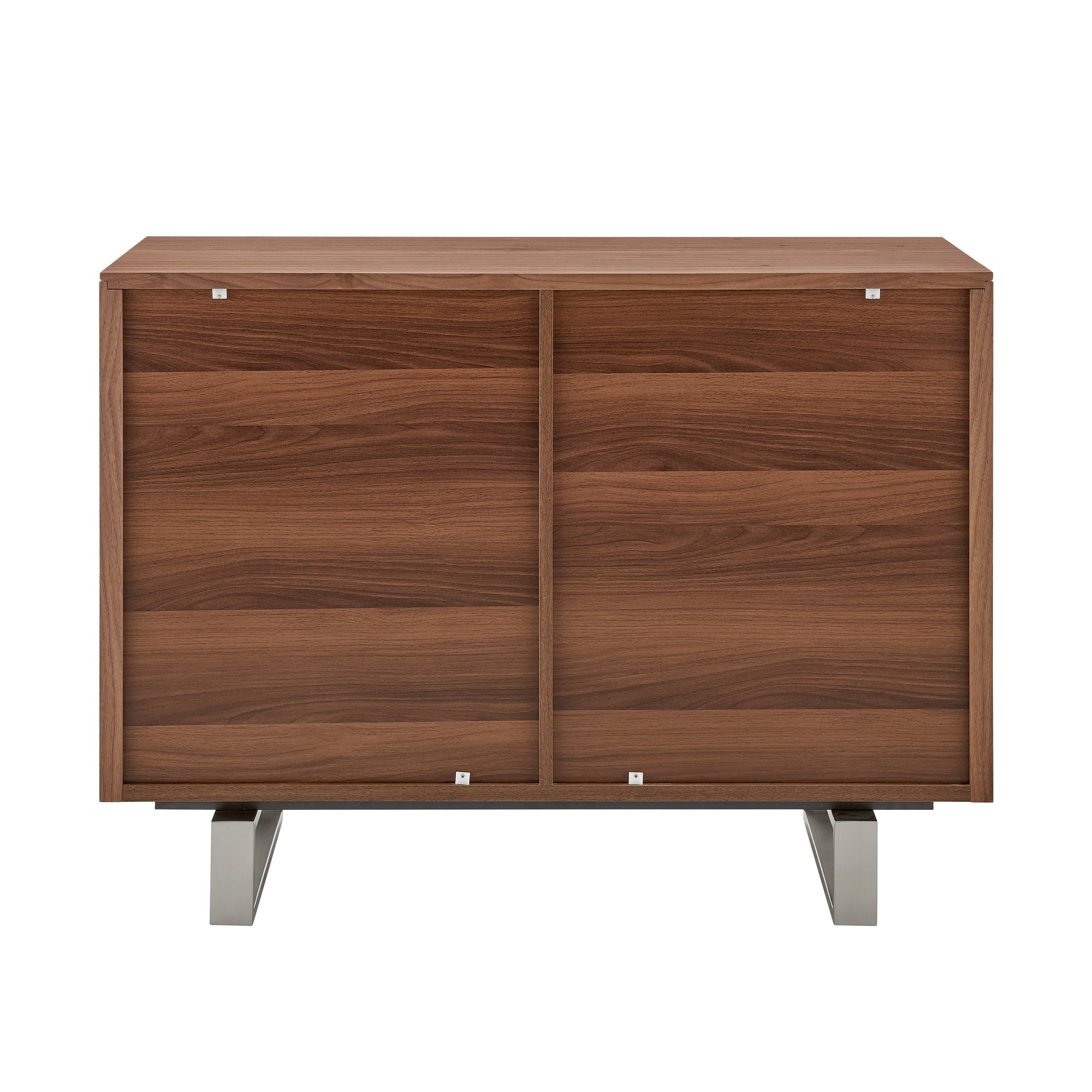 The Alvarado Sideboard, with its contemporary lines, is as stunning as it is functional. This 40-inch sideboard features an American walnut veneered MDF outer frame and brushed stainless steel legs and handles. There are two compartment doors, designed with a chevron pattern, that enclose ample space and shelves for convenient storage.