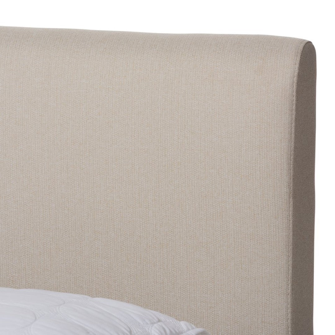 - Mid-century modern design: smooth lines, neutral beige upholstery, and a distinctive vertical center line tuft that creates a split-cushion look on the headboard.