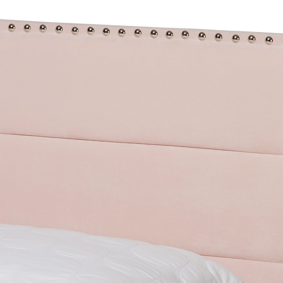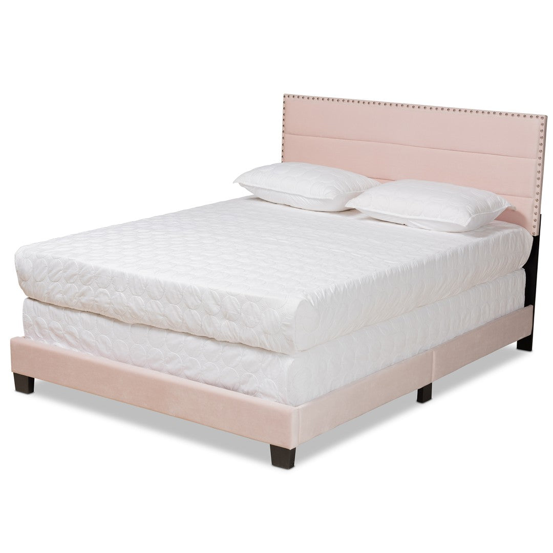 Transform your bedroom into a modern glam retreat with the Tamira upholstered panel bed. Plush light-pink velvet, a channel-tufted headboard, and silver nailhead trim combine for a luxe, contemporary look while thick foam padding and engineered wood construction ensure lasting comfort and support. Designed for a full-size mattress, this bed requires a box spring and quick assembly, making it an elegant yet practical centerpiece for stylish bedrooms.