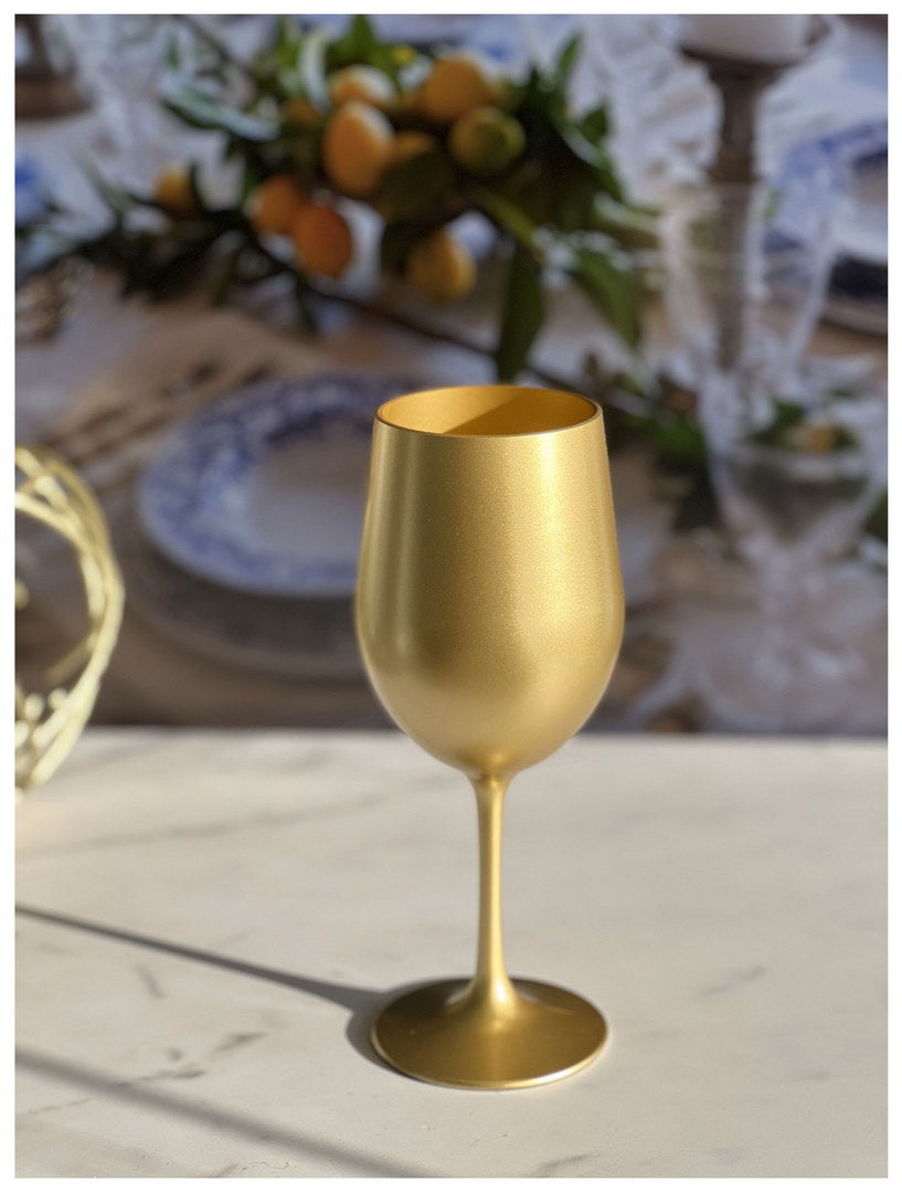 Enjoy elegant entertaining without the worry of broken glass. These metallic gold acrylic wine glasses combine the look of stemmed glassware with the durability and convenience of BPA‑free plastic—perfect for indoor dinners, poolside parties, and casual outdoor gatherings. Lightweight and crystal-clear with a luxurious gold finish, this set of four offers the style of traditional wine glasses while staying shatterproof and easy to use.